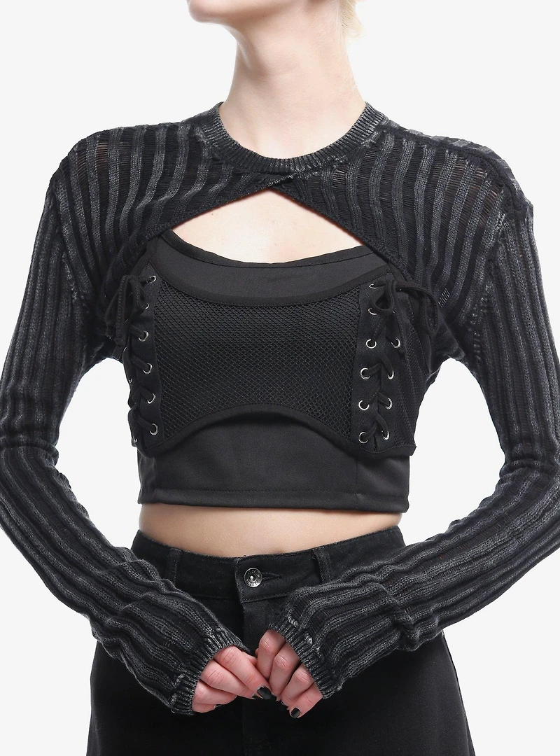Keep it cozy and trendy with this cropped shrug! Knit in a dark wash, this ribbed bolero sweater is the perfect layering piece for any street look. Please note: Wash pattern may vary.