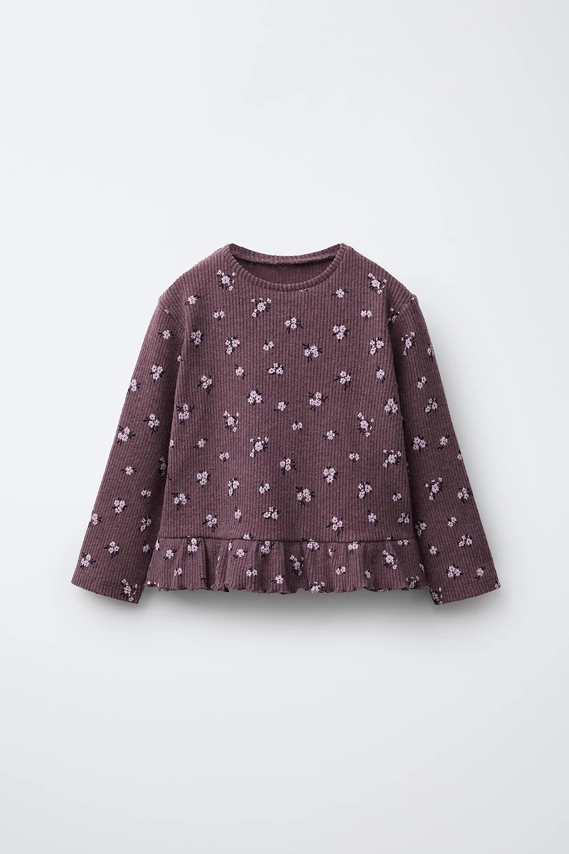 Round neck long sleeve T-shirt. Ruffle hem. All-over print. Soft touch fabric and 50% cotton.