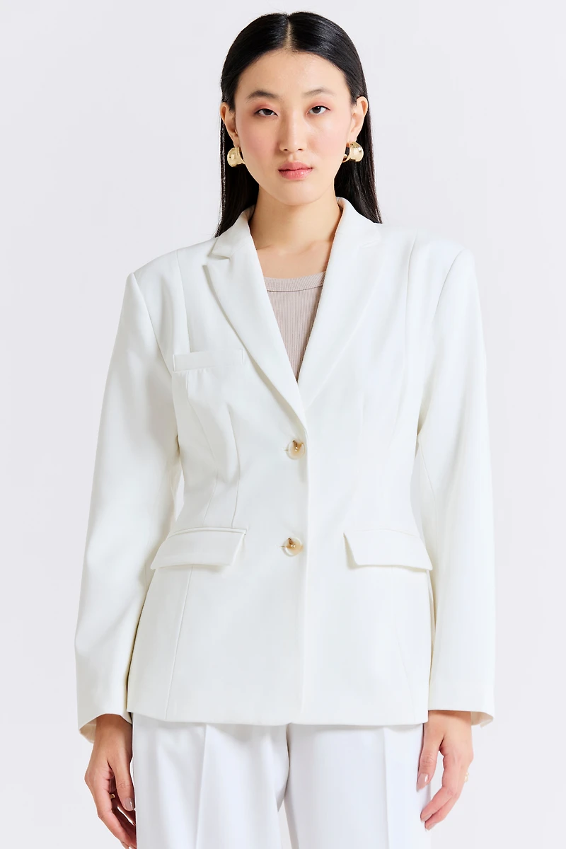 - blazer—a refined staple for the modern wardrobe. This blazer features a tailored fit with sharp lapels, padded shoulders, and a double-button front for a polished, empowered look. Functional welt pockets and clean seam lines add a touch of classic tailoring. Whether layered over a blouse for work or styled with matching trousers for a monochromatic moment, this piece delivers timeless elegance with a contemporary edge.