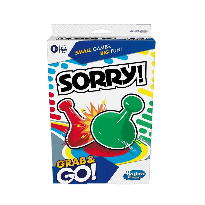 Sorry! Grab and Go – Classic Family Fun, Anytime Anywhere Take the excitement of a timeless family favorite wherever you go with the Sorry! Grab and Go Game for Kids by Hasbro. This compact, travel-friendly version of the classic Sorry! board game delivers all the thrills of racing, sliding, and sending opponents back to start—now in a convenient portable format. Designed for 2 to 4 players aged 6 and up, this game is perfect for family game nights, road trips, vacations, or quick play sessions at home. Players draw cards to move their pawns around the board, aiming to be the first to get all four pieces safely from Start to Home. But watch out—landing on another player’s space sends them right back to the beginning in a fun twist of “sweet revenge”! Despite its compact size, this version keeps the full excitement of the original gameplay. Slides, backward moves, and strategic decisions make every round unpredictable and engaging. The all-in-one plastic case includes built-in storage, so you can pack up quickly and take the game anywhere without losing pieces. Whether you're entertaining kids during travel or enjoying a quick competitive match with friends, the Sorry! Grab and Go game delivers fast-paced fun in a lightweight and portable design. It’s also a great gift option for families, young gamers, and anyone who loves classic board games in a convenient format. Key Features Portable Travel Design: Compact all-in-one case makes it perfect for trips and on-the-go play Classic Sorry! Gameplay: Race your pawns home while sending opponents back to start Quick & Easy Setup: Simple rules and fast gameplay for instant fun Family-Friendly Fun: Designed for 2–4 players, ages 6+ Built-In Storage: Keep all pieces organized inside the case