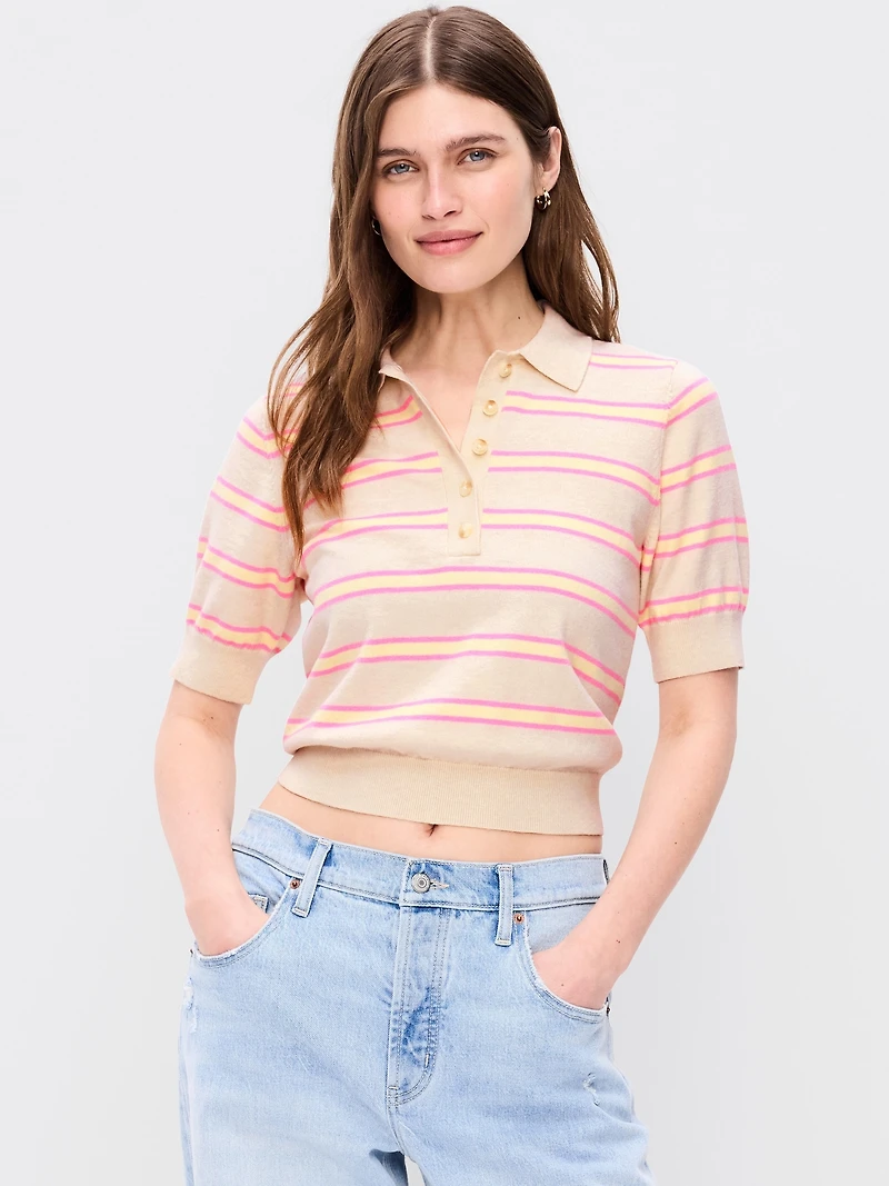 spread collar 4-button placket elbow-length short sleeves rib-knit trim pullover style