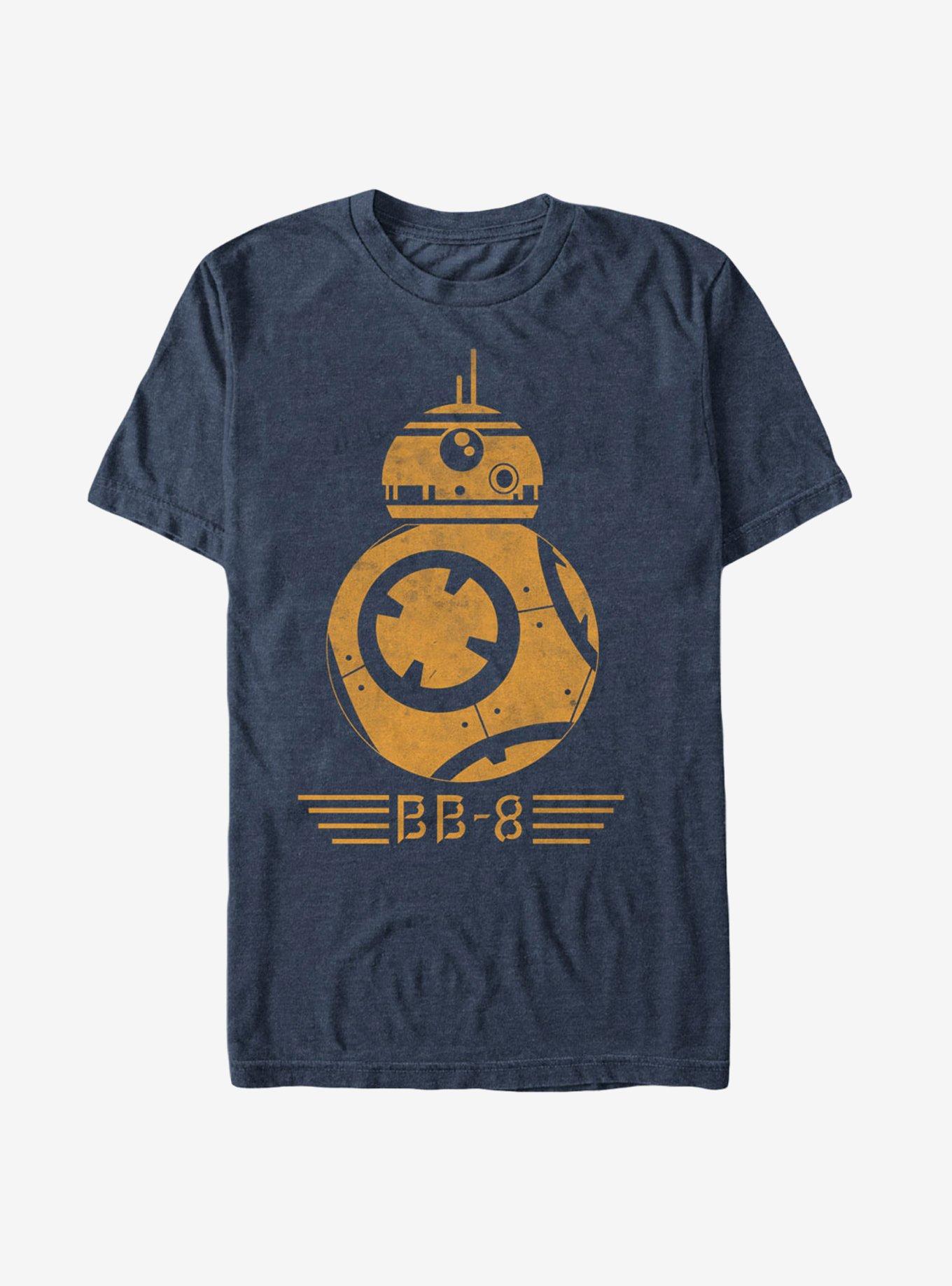 Get to know Poe Dameron's trusted pal with the Star Wars BB-8 Droid Heather Navy Blue T-Shirt. A sleek distressed yellow-orange print of BB-8 rolling happily along is featured on the front of this awesome navy blue men's BB-8 T-shirt. 60% Cotton, 40% Polyester.