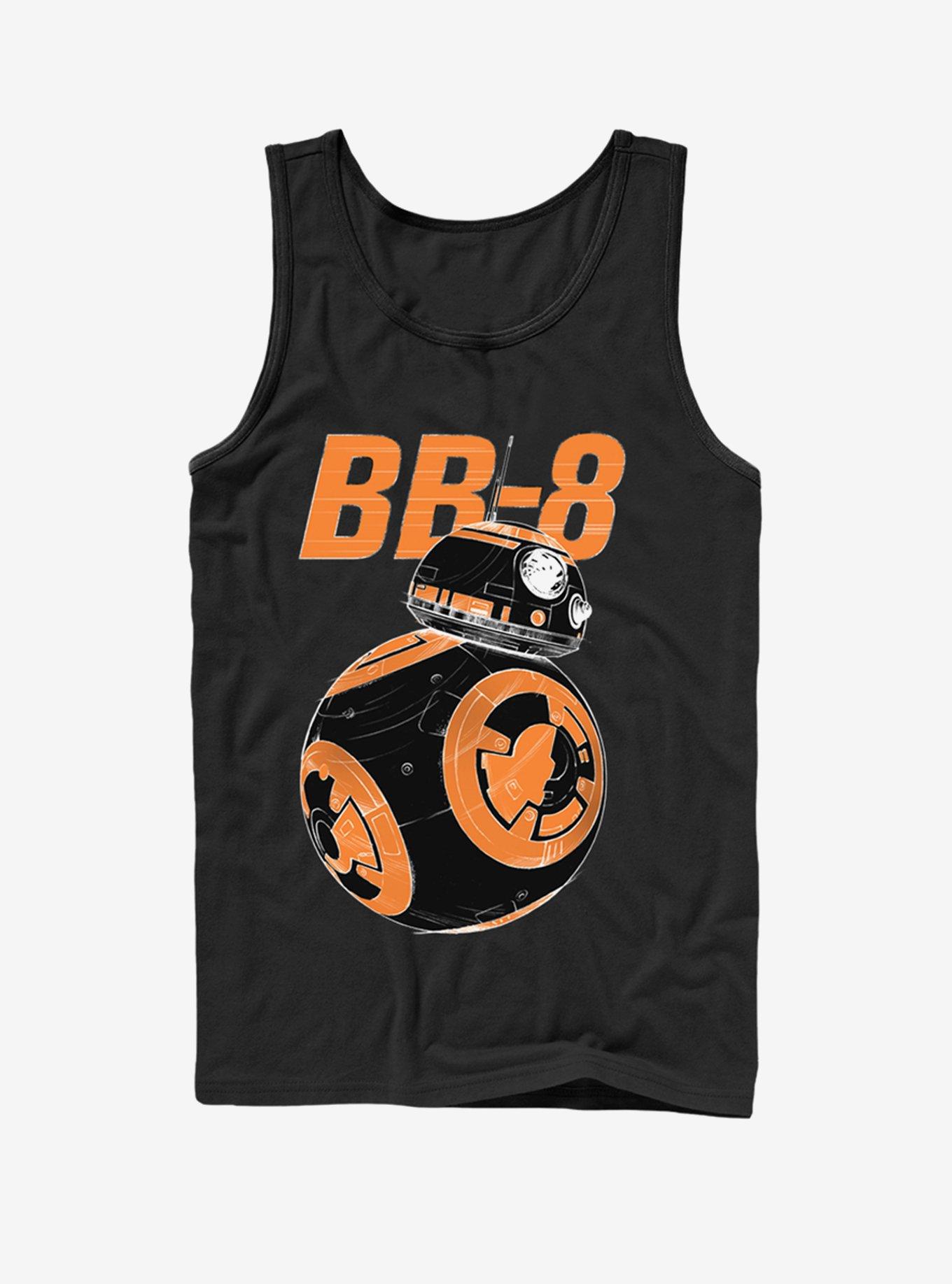Before you meet up with Rey and Finn, slip into the Star Wars BB-8 On the Move Black Tank Top. BB-8, the spunky little droid who helps Poe Dameron complete his mission, is printed below his name on the front of this awesome black BB-8 shirt. 100% Cotton.