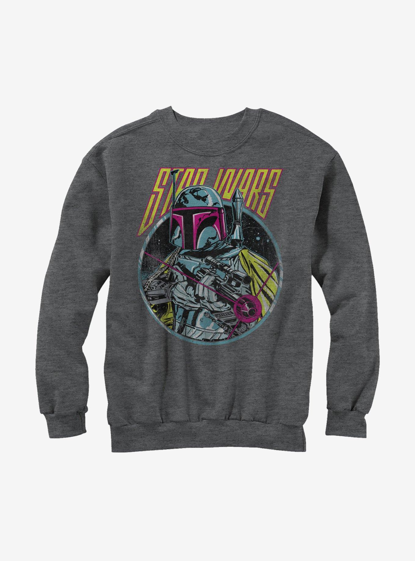 Check out the galaxy's top bounty hunter in action with the Star Wars Boba Fett Blaster Heather Charcoal Sweatshirt. Expert gunman Boba Fett is shown wielding a blaster on the front of a gray sweatshirt with "Star Wars" printed above. 50% Cotton, 50% Polyester.
