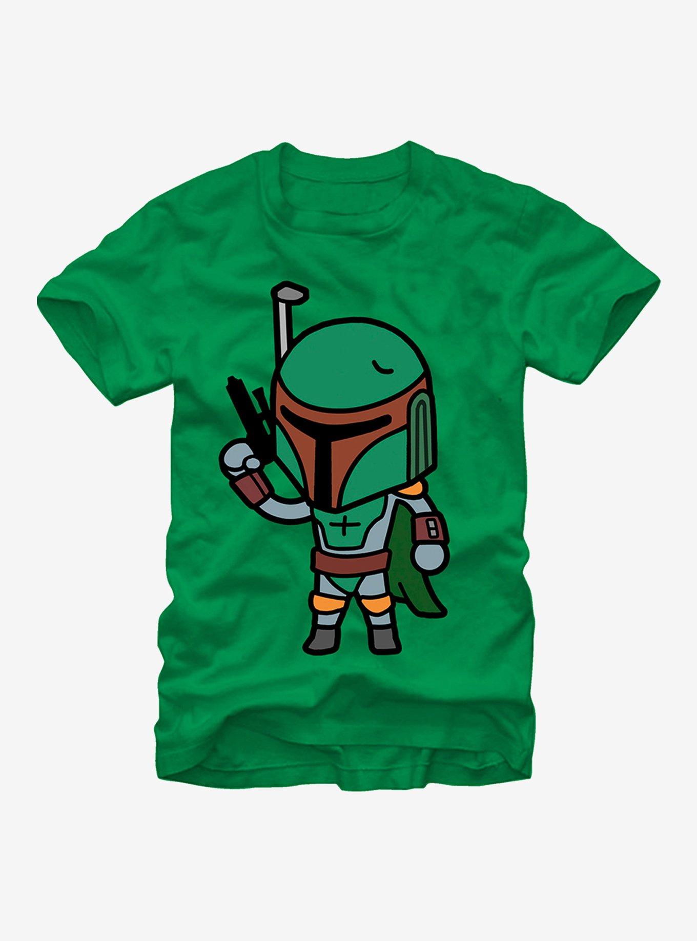 Make Mandalore a little more fun with the Star Wars Boba Fett Cartoon Kelly Green T-Shirt! A cartoon version of Boba Fett, the best bounty hunter in a galaxy far away, is printed on the front of this awesome green Boba Fett tee. 100% Cotton.