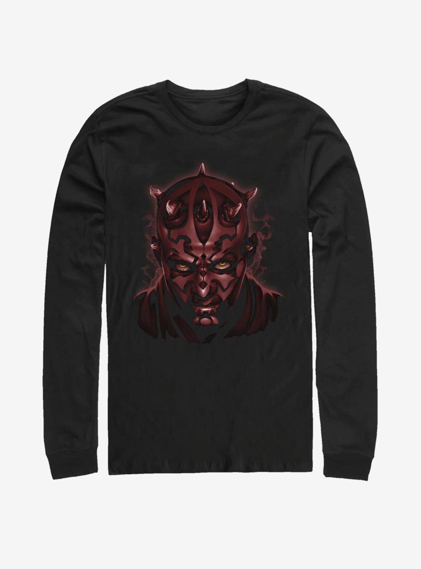 Revenge. I must have revenge. This long-sleeved black Star Wars tee features a close-up of the deadly Darth Maul.