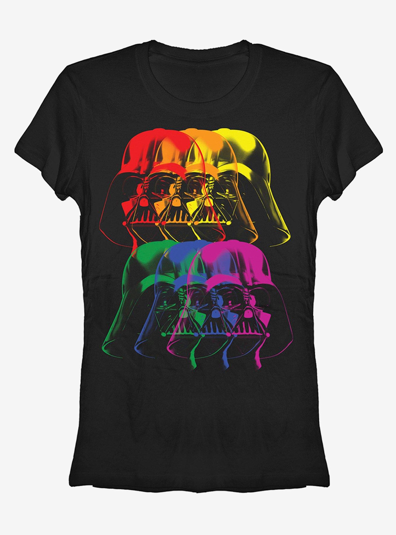 Add some color to the Dark Side of the Force with the Star Wars Darth Vader Helmet Rainbow Black T-Shirt. Darth Vader's helmet is printed in an array of shades on the front of this awesome fitted black shirt for an eye-catching Star Wars print. 100% Cotton. Runs small, size up.
