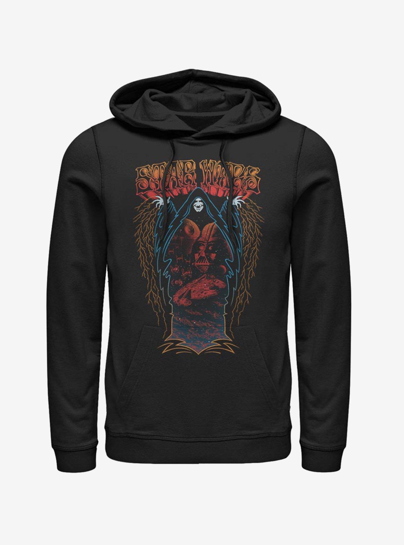 Far out and far, far away. This black pullover Star Wars hoodie features a psychedelic Emperor Palpatine, Darth Vader, Death Star and Millennium Falcon graphic.