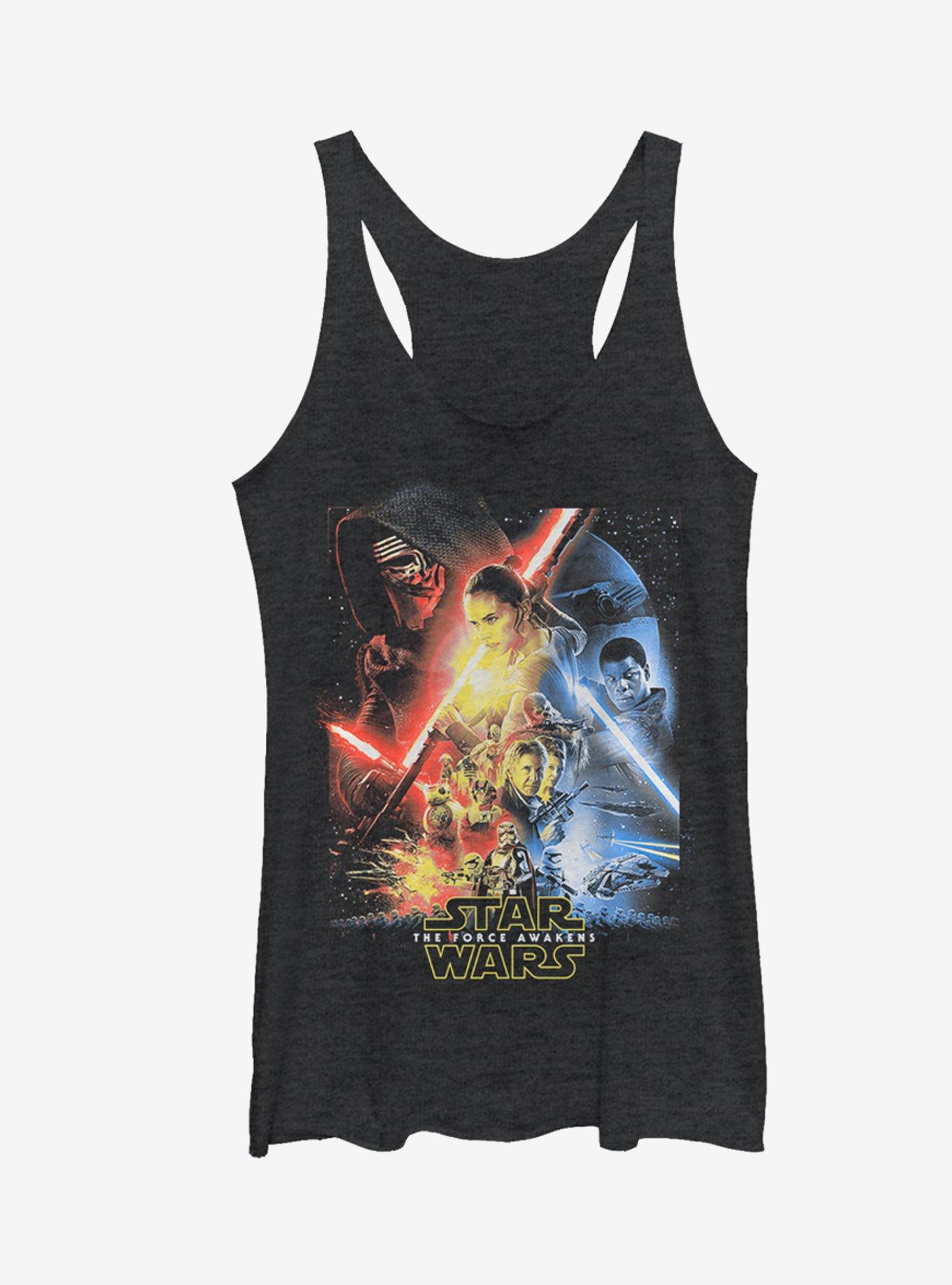 The Star Wars Episode VII Cool Poster Heather Black Racerback Tank Top is here to help you use the Force. All you favorite Star Wars The Force Awakens characters including Kylo Ren, Rey, Finn, Han Solo, General Leia, BB-8, Captain Phasma, and more are featured in the movie poster printed on the front of this cool black Star Wars Episode 7 shirt. 50% Polyester, 25% Cotton, 25% Rayon.