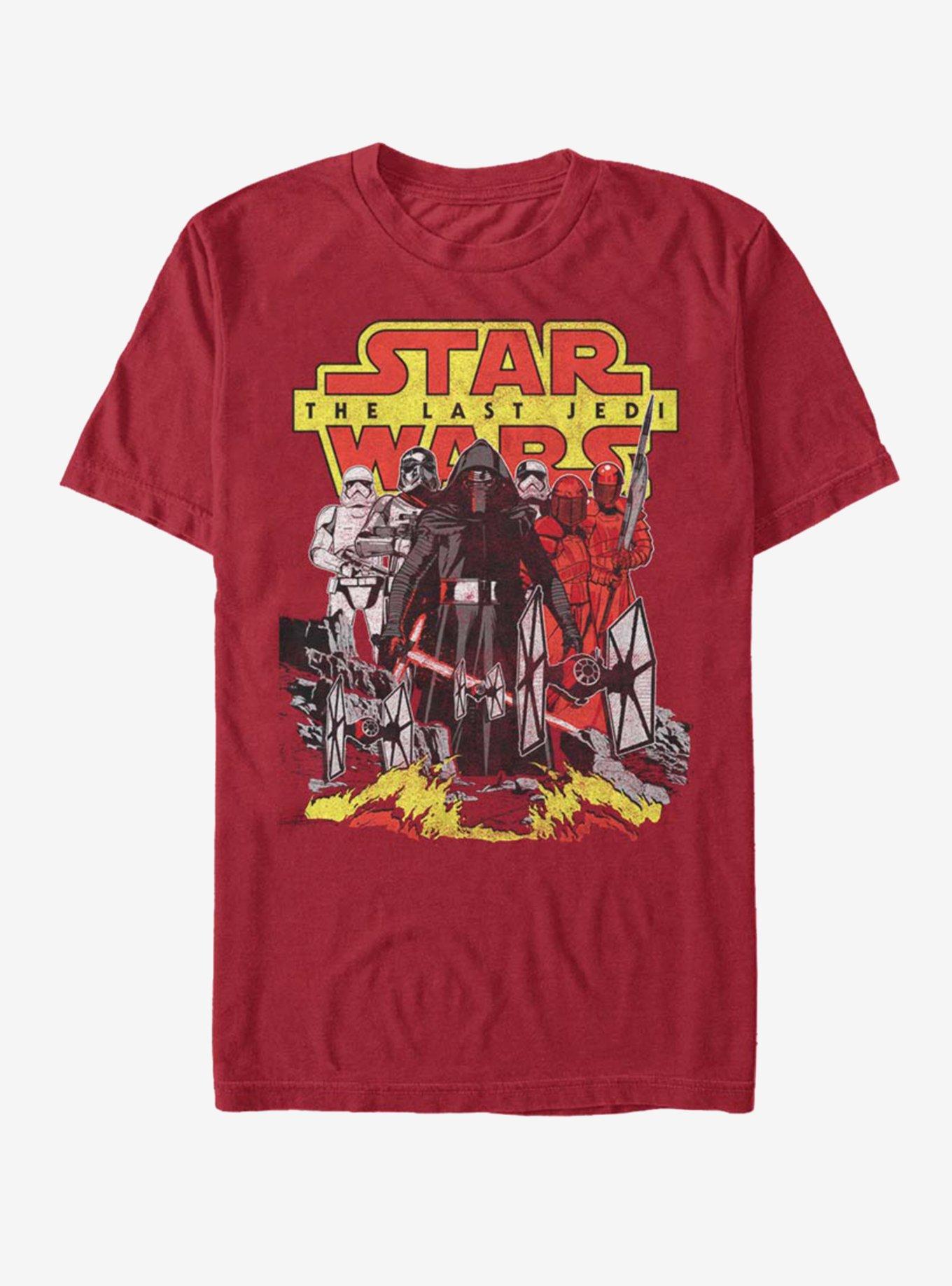 Get ready to be awed by the power of the First Order with the Star Wars The Last Jedi First Order Defense Cardinal Red T-Shirt! Kylo Ren is surrounded by an army of stormtroopers, elite guards, and Captain Phasma while the Last Jedi logo is printed in a red and yellow retro style behind them on this cool red Episode 8 shirt. 100% Cotton.