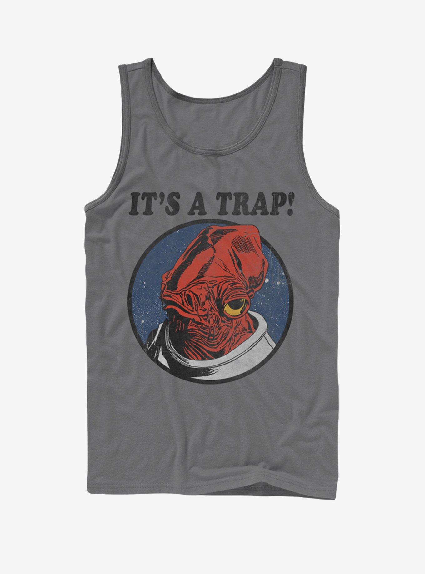 Admiral Ackbar and his famous line from the Battle of Endor are the starring features of the Star Wars It's a Trap Admiral Ackbar Charcoal Gray Tank Top. "It's a trap!" is printed at the top of this awesome gray Star Wars muscle tee, with Akbar posing below. 100% Cotton.