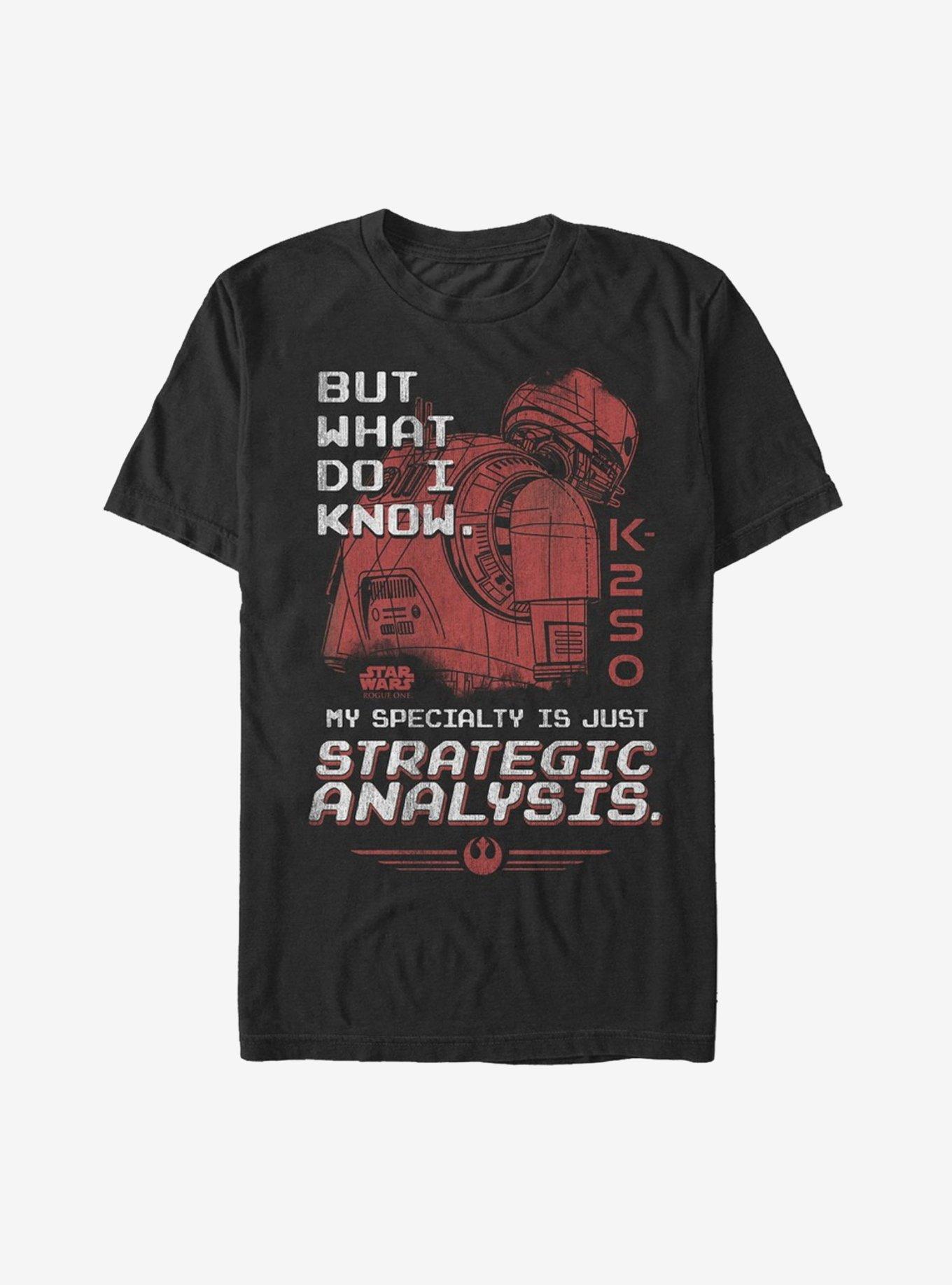 K-2SO is known for his strategic analysis skills and he's here to analyze the Star Wars Rogue One K-2SO Strategic Analysis Black T-Shirt for you! K-2SO is portrayed in a distressed red with his funny quote "But What Do I Know. My Specialty is Just Strategic Analysis" across the front of this cool black K-2SO shirt. 100% Cotton.