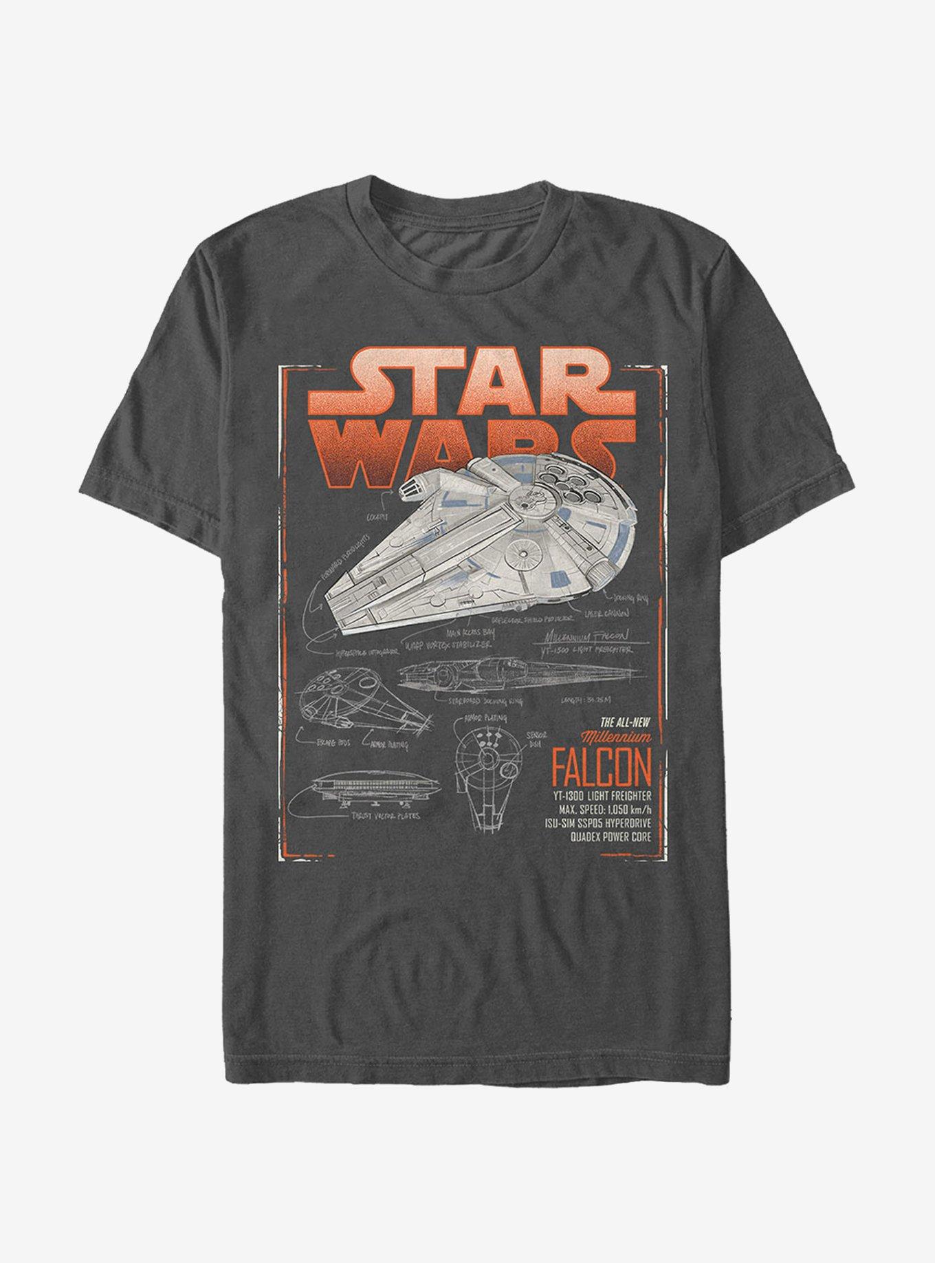 Check out the Millennium Falcon in its glory days with the Solo: A Star Wars Story Millennium Falcon Schematics Men's T-Shirt! Han Solo's beloved ship is featured in schematic detail with "The All-New Millennium Falcon" across the front of this Star Wars tee.