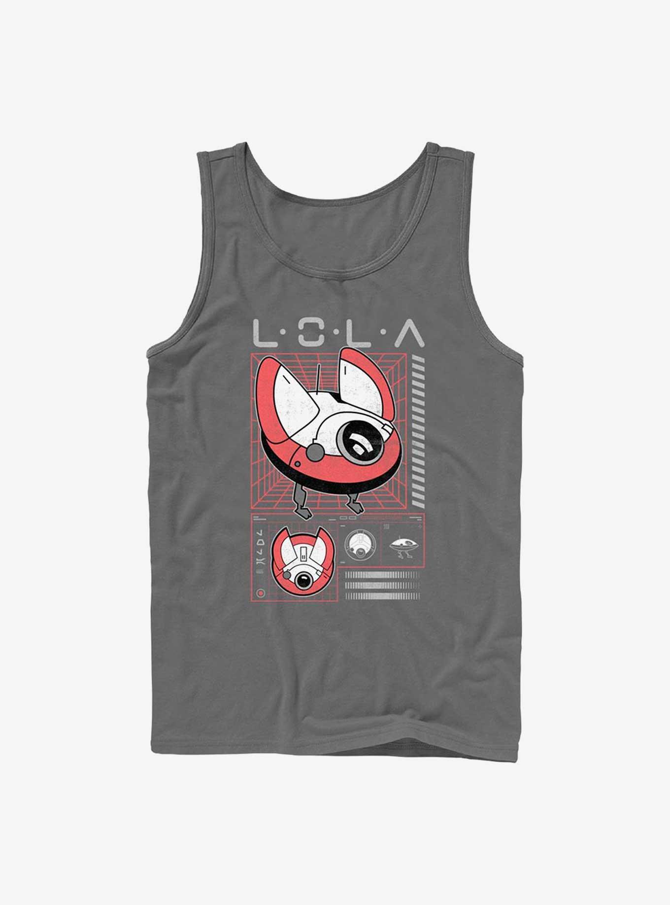 New. Favorite. Droid. L0-LA59 -- or Lola for short! -- appears as cute as ever on this charcoal grey tank top, inspired by the Disney+ series Star Wars: Obi-Wan Kenobi .