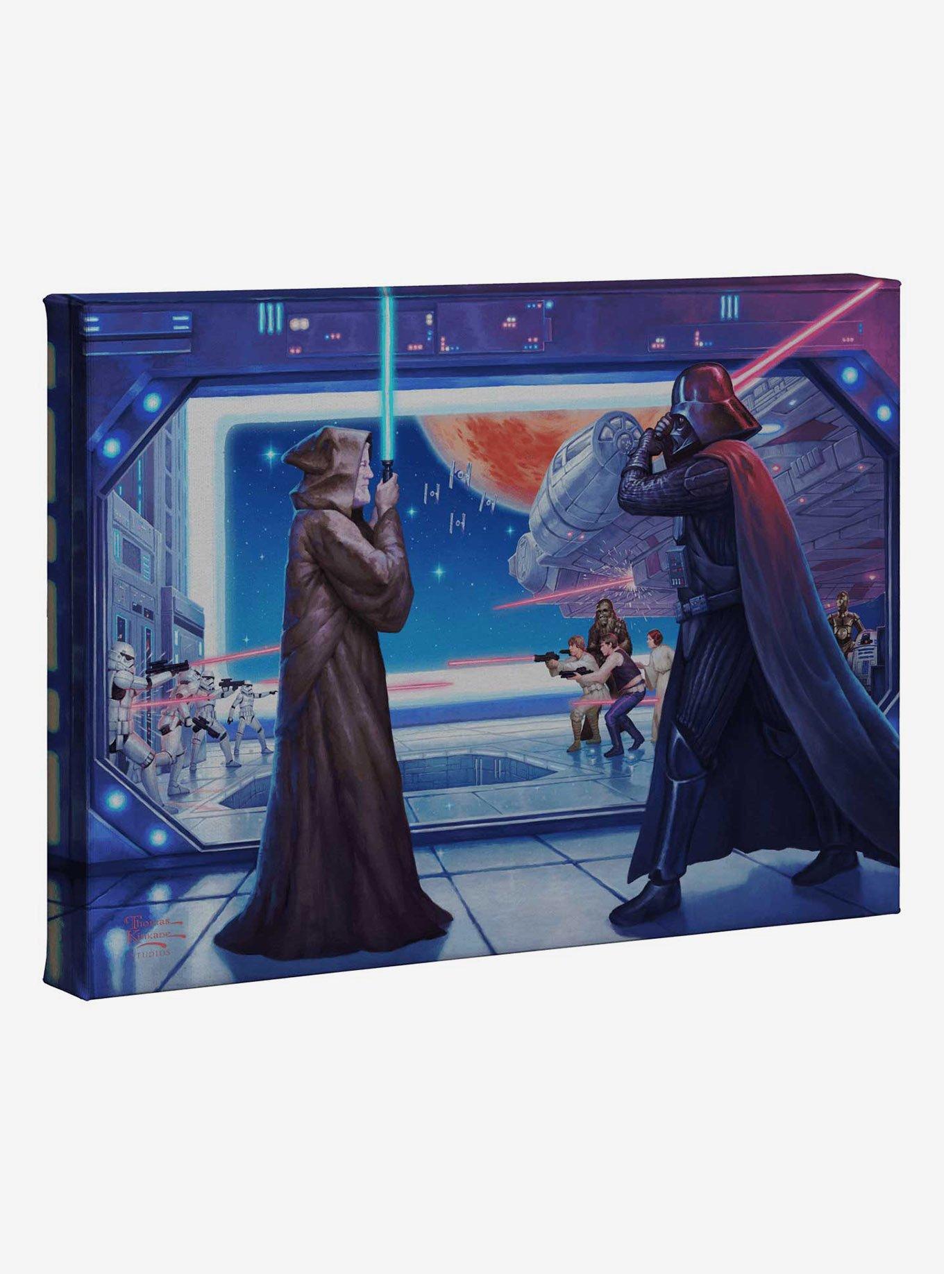 Thomas Kinkade Studios Gallery Wraps are perfect for any space. Each wrap is crafted with our premium canvas reproduction techniques and hand wrapped around a deep, hardwood stretcher bar. Hung as an ensemble or by itself, this frame-less presentation gives you a versatile way to display art in your home. Certificate of authenticity included. The Rebels are fighting their way to the safety of the Millennium Falcon . Our heroes and the Stormtroopers are all temporarily distracted by an epic battle of Good vs Evil. All eyes seem to turn to this conflict. Obi-Wan's Final Battle by Thomas Kinkade Studios depicts the final moments of the Lightsaber battle between Obi-Wan Kenobi and Darth Vader. Obi-Wan feels secure knowing that Luke Skywalker is on his journey towards becoming the Jedi he was always destined to be. Would Luke mature into the Jedi that the prophecy said would save the Force? That is for the future to determine. Item cannot be shipped to P.O. Boxes