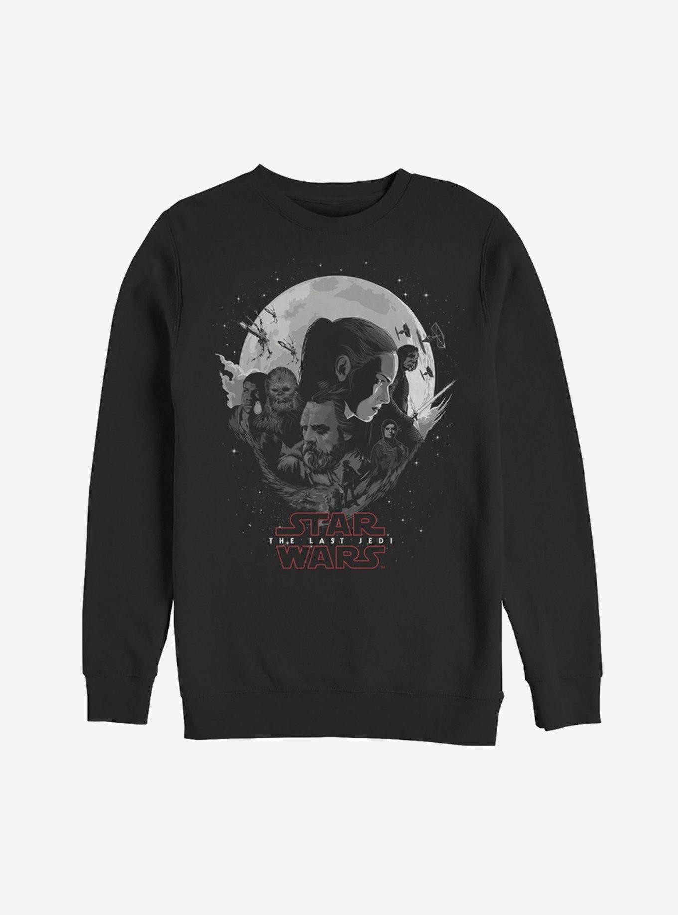 Rey needs your help to protect the Star Wars The Last Jedi Planet Logo Black Sweatshirt from the First Order! This cool character collage shows off Rey, Chewie, Finn, Poe, and Luke Skywalker across a glowing white planet on this awesome black Episode 8 sweatshirt. 50% Cotton, 50% Polyester.
