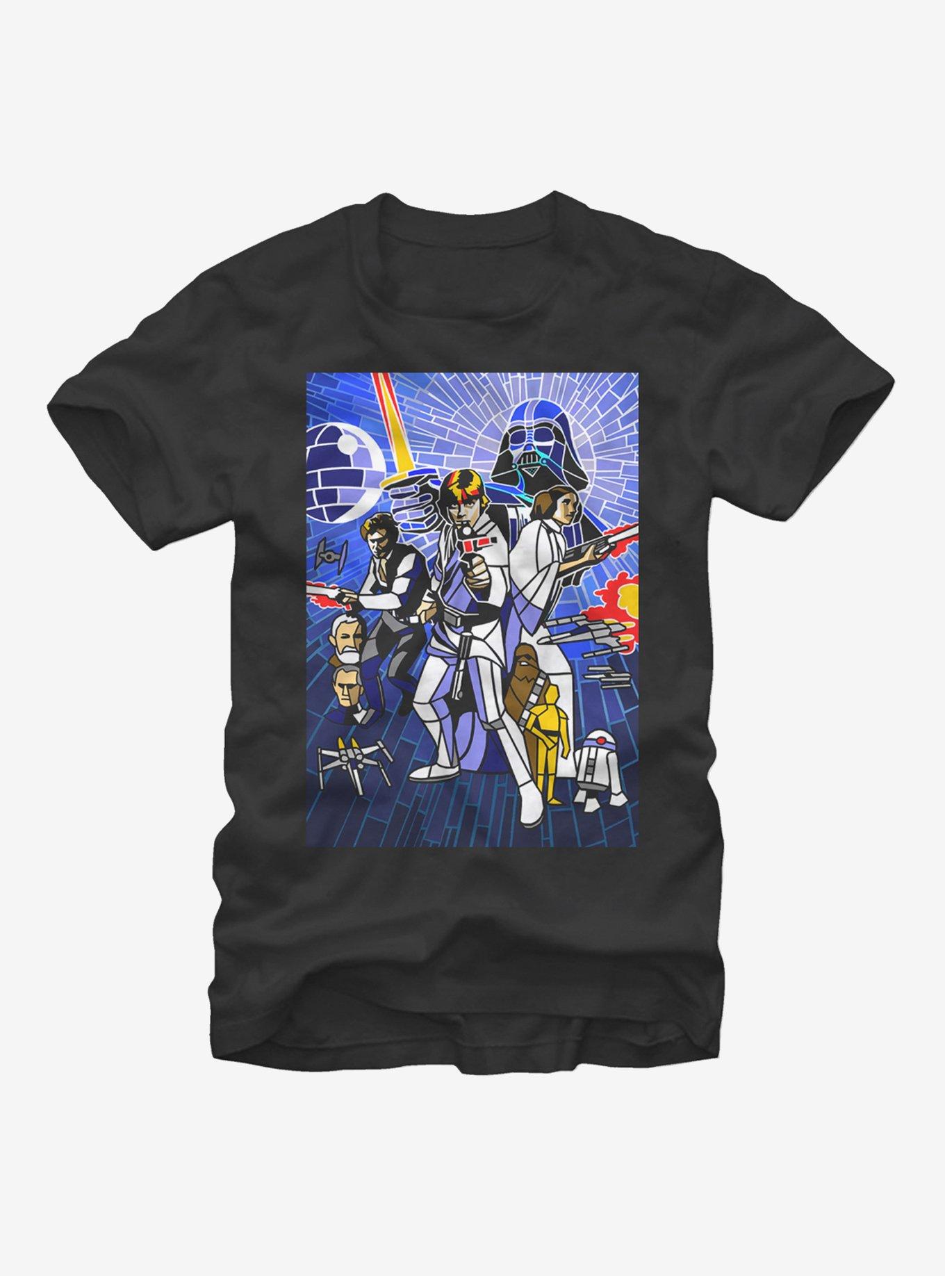 See classic Star Wars artwork like never before with the Star Wars Stained Glass Poster Black T-Shirt. Luke Skywalker, Han Solo, Princess Leia, Darth Vader, R2-D2, C-3PO, and more are printed in the style of stained glass on the front of this unique Star Wars shirt. 100% Cotton.