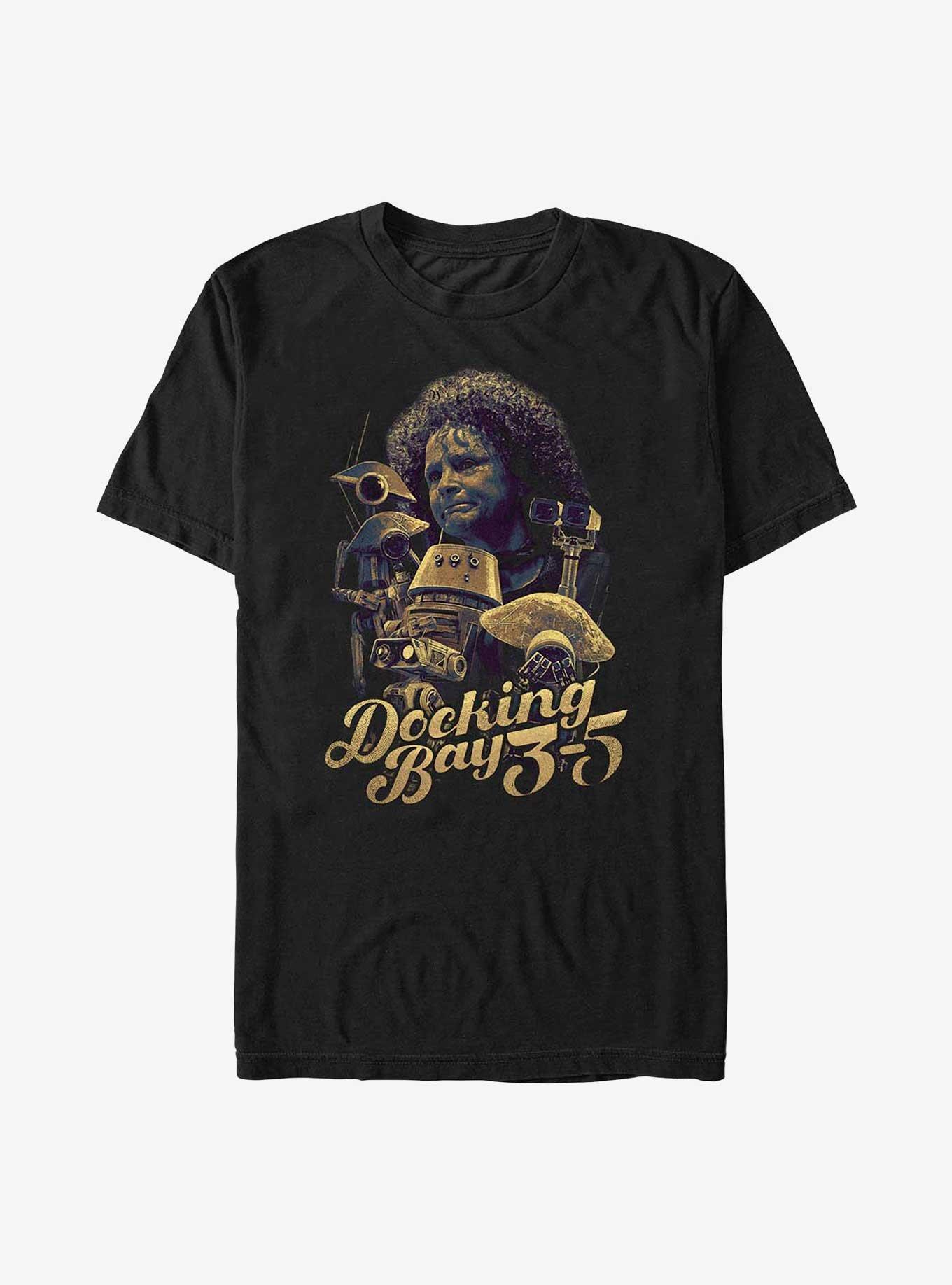 You'll find all the droids you need at Peli Motto's shop in Mos Eisley! This lightweight black graphic tee -- inspired by the Disney+ series Star Wars: The Book of Boba Fett -- features all things Docking Bay 3-5.