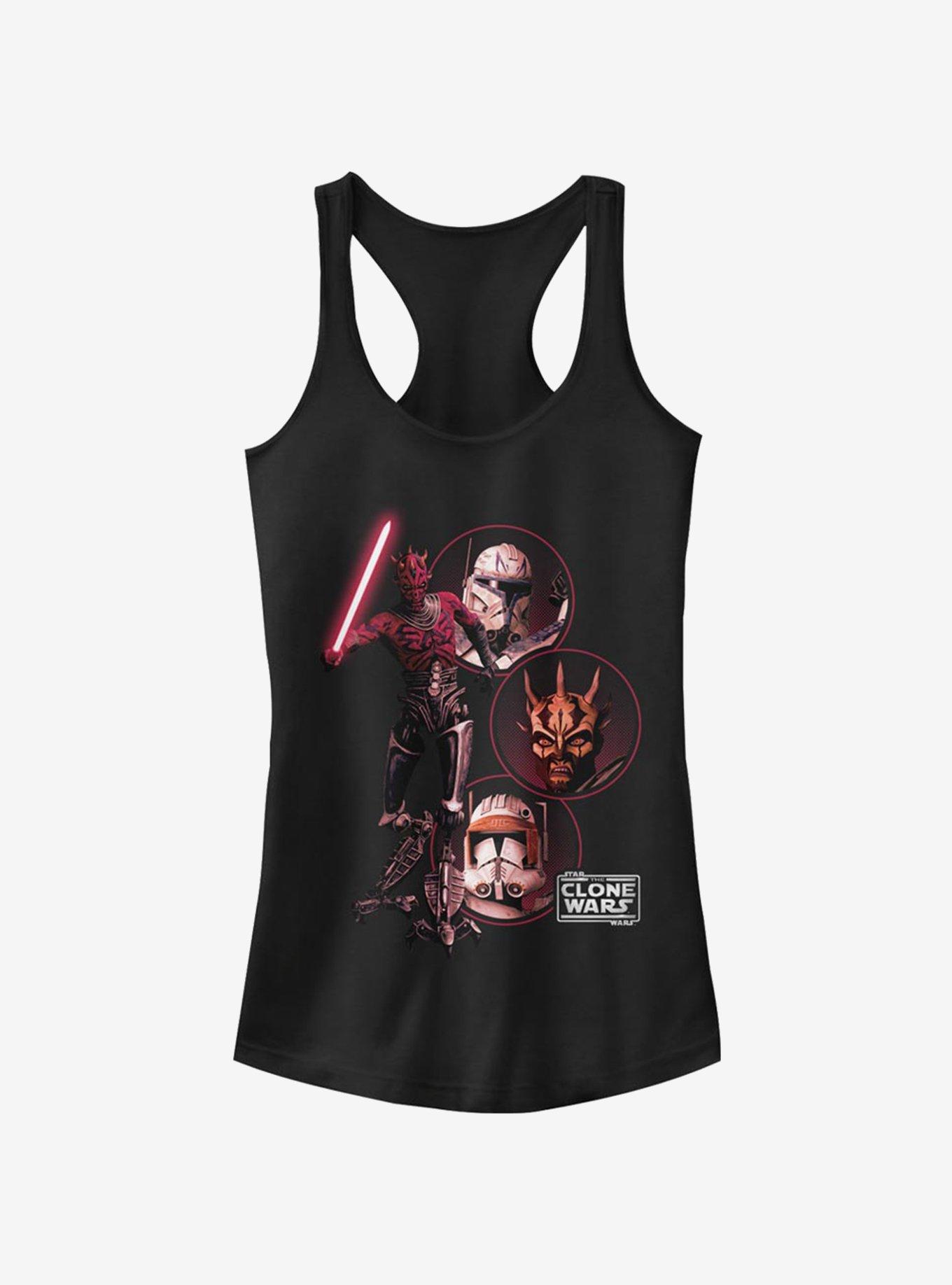 The Dark Side of Star Wars animation meets a couple of Clones. This black racerback tank features Maul and Savage Opress -- with Captain Rex and Commander Cody.