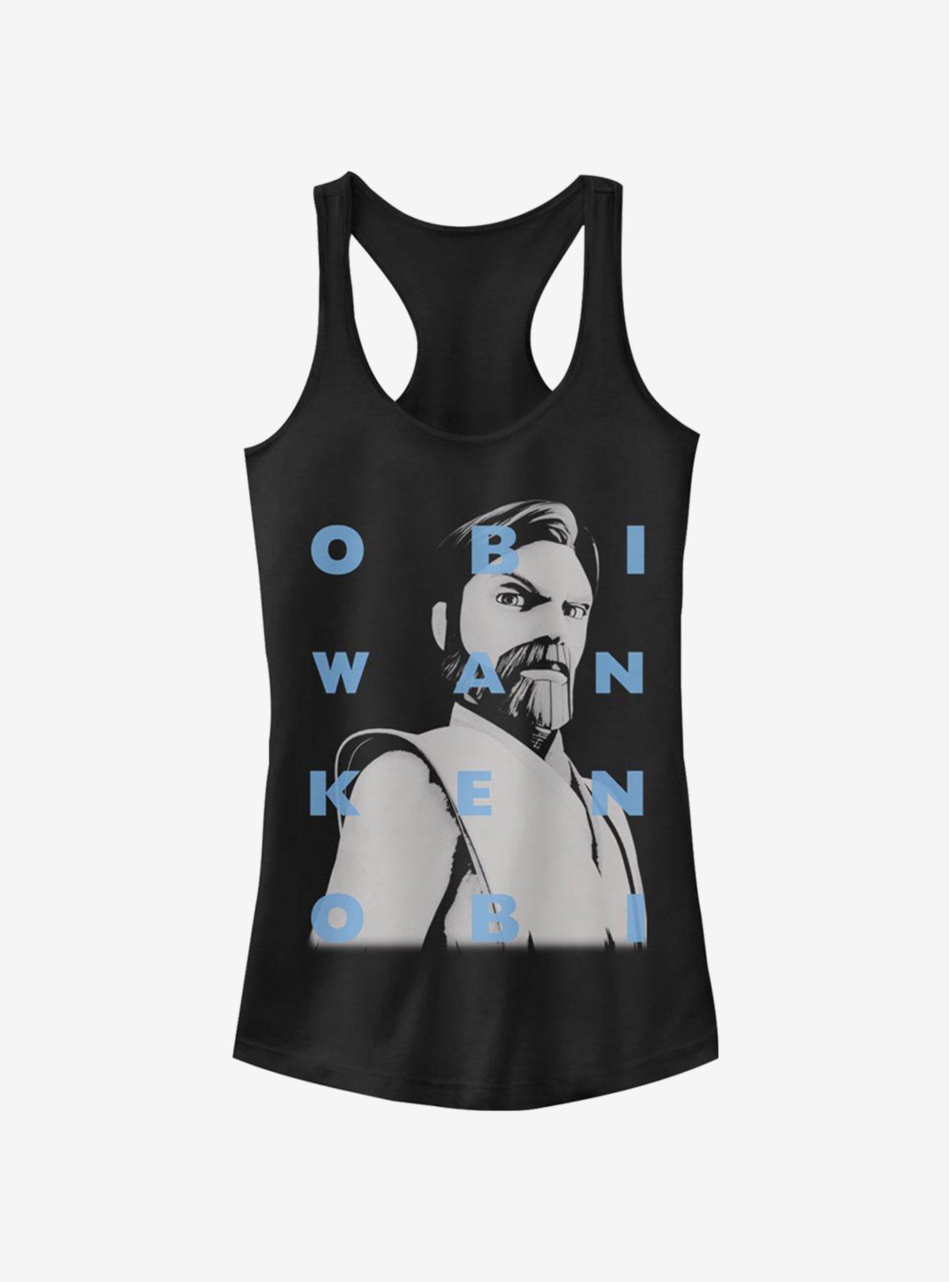 "A great leap forward often requires first taking two steps back." This black racerback tank features General Obi-Wan Kenobi, as seen in the animated series Star Wars: The Clone Wars , with his name in in block lettering.