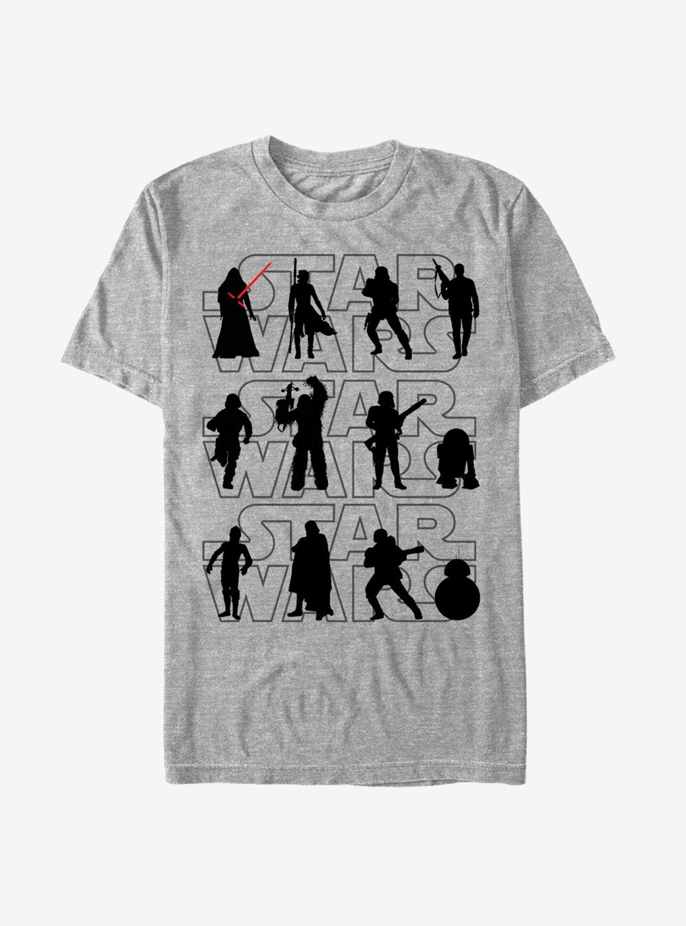 There has been an awakening. Have you felt it? The Star Wars Episode VII Character Silhouettes Heather Gray T-Shirt has. The Star Wars logo is printed three times on this cool Episode 7 T-shirt with the silhouettes of characters including Rey, Kylo Ren, Finn, Poe Dameron, Chewbacca, BB-8, and more printed over the top. 60% Cotton, 40% Polyester.