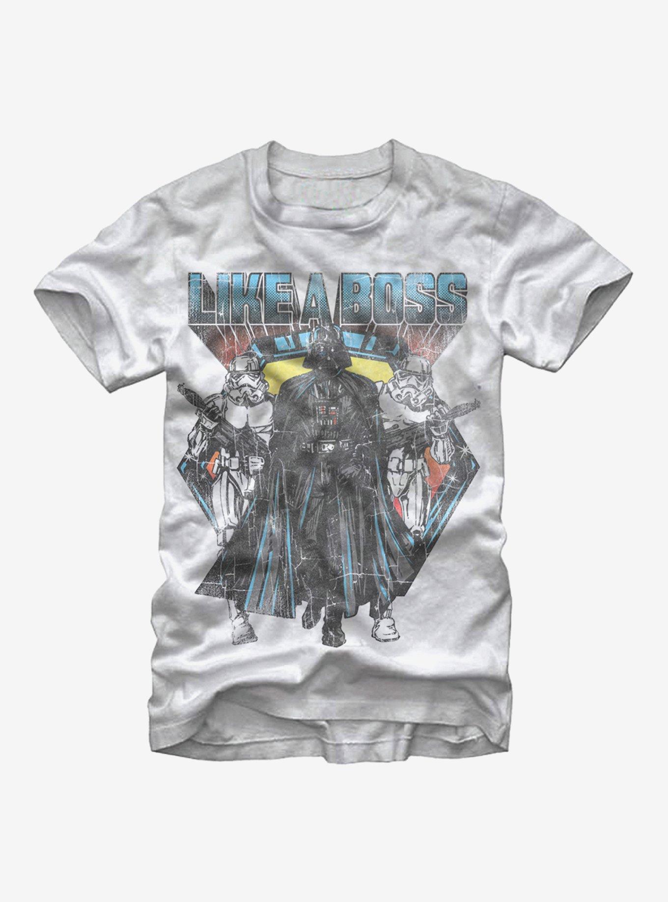 With his epic helmet, black cape, and menacing music every time he enters a room, Darth Vader is a villain you do not want to mess with. The Star Wars Vader Like a Boss White T-Shirt reads "Like a boss" above Darth Vader and two stormtroopers. 100% Cotton.