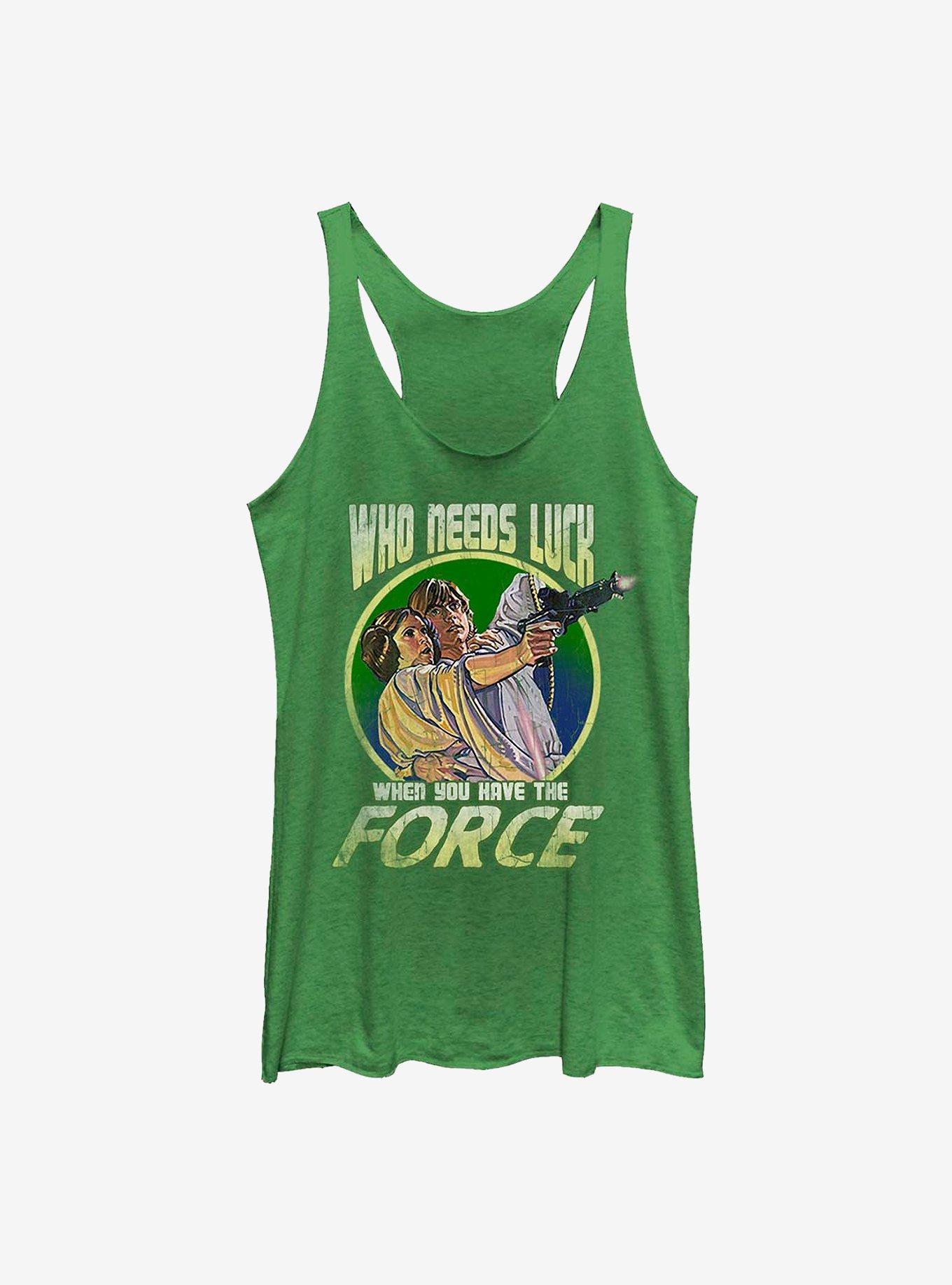 When it comes to saving the universe, luck has NOTHING to do with it! This envy green racerback Star Wars tank features an image of Luke Skywalker and Princess Leia with text that reads, "Who needs luck when you have the Force."