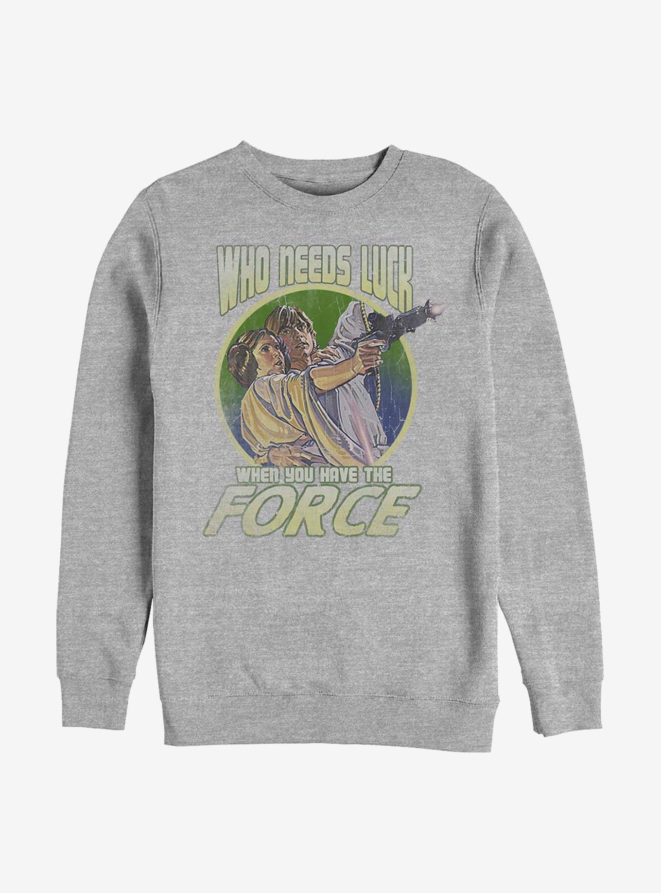 When it comes to saving the universe, luck has NOTHING to do with it! This heather grey crewneck Star Wars sweatshirt features an image of Luke Skywalker and Princess Leia with text that reads, "Who needs luck when you have the Force."