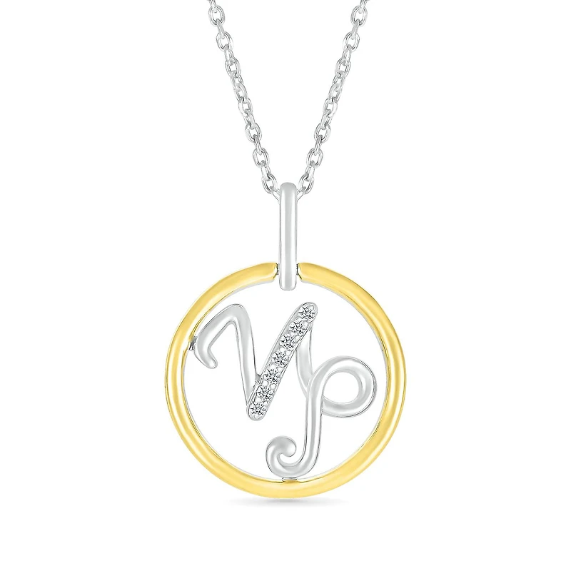 This pendant features a Capricorn zodiac symbol, crafted in a combination of sterling silver and 10K yellow gold, with sparkling diamonds accentuating the design. The diamonds add a touch of elegance and brilliance to the piece, while the mix of metals gives it a modern, sophisticated look.