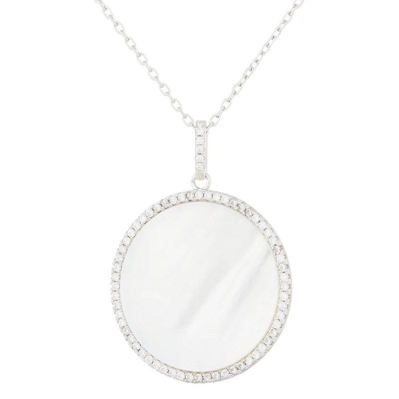 A 23mm white mother of pearl pendant surrounded by cubic zirconias in sterling silver rhodium plated