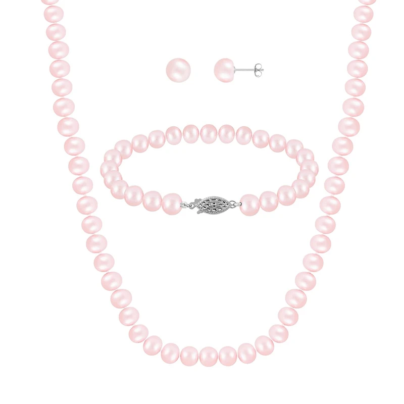 Sterling Silver 7-8mm Pink Freshwater Pearl Bracelet Earrings and Necklace Set
