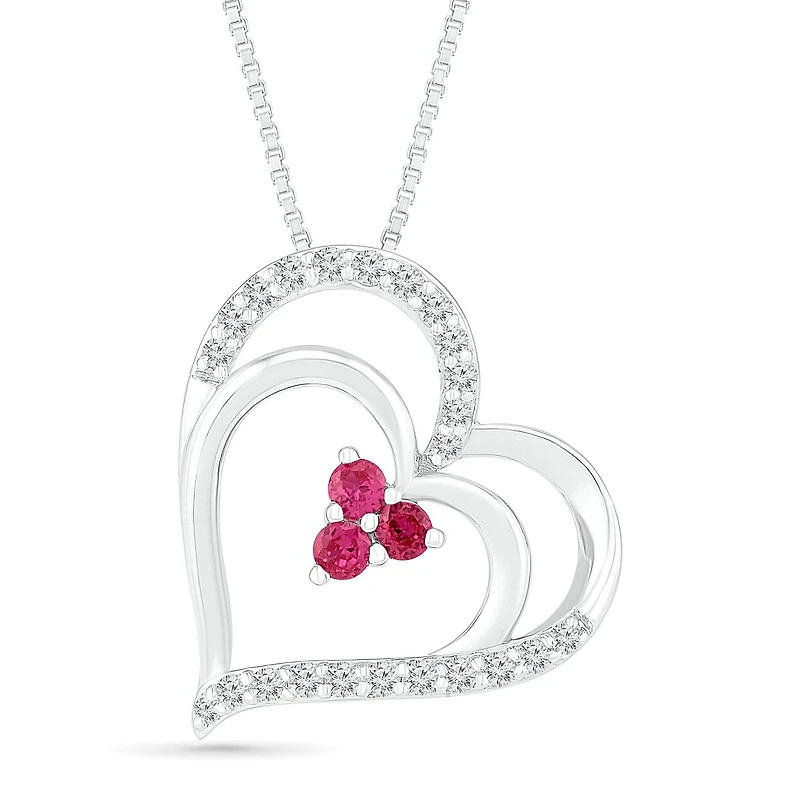 This open heart necklace is crafted in sterling silver and showcases created rubies accented by swirls of shimmering created white sapphires. Choose this gorgeous piece as a perfect symbol of true love and devotion.