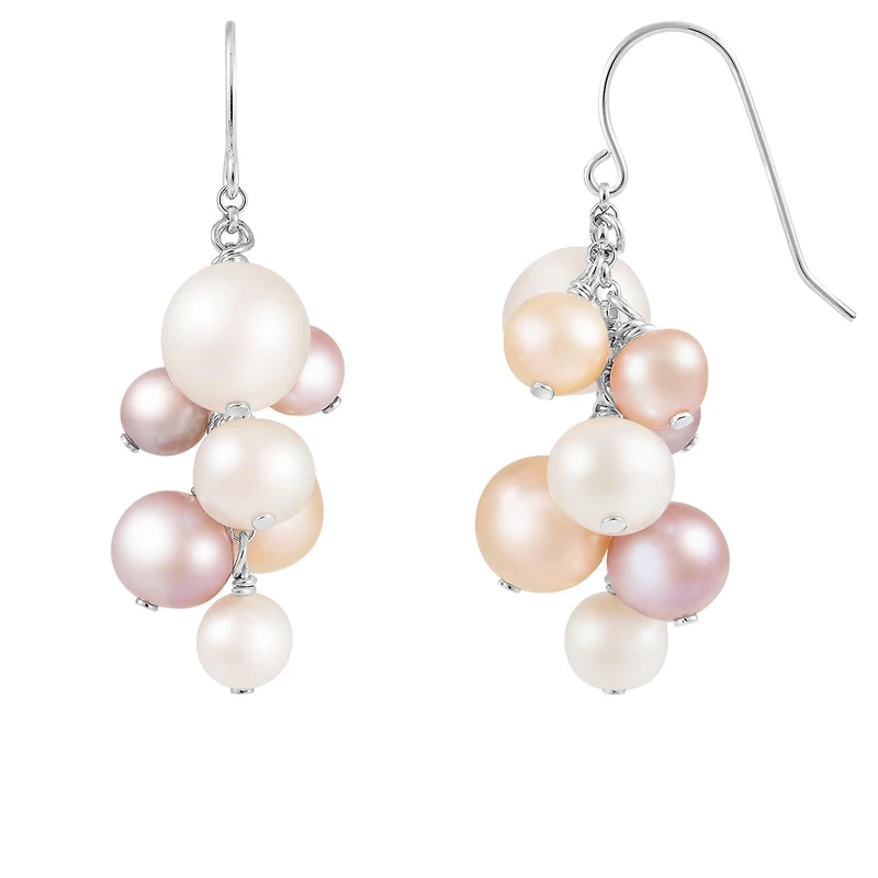 Featuring a selection of lustrous freshwater pearls in a range of colours—ivory, pink, and lavender—the earrings exude a playful yet sophisticated charm. Set in high-quality sterling silver, the design allows the pearls to shine, creating a beautiful contrast with the polished metal.