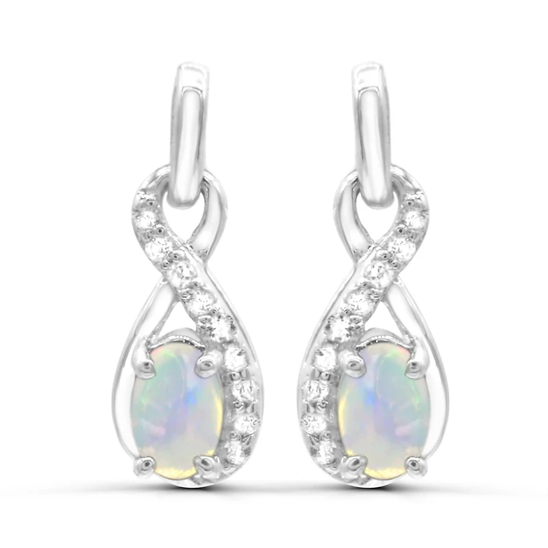 These modern yet classic, infinity design earrings are crafted in gleaming sterling silver and are sure to become a favourite item in your jewellery collection. This item is perfectly adorned with shimmering white topaz and two oval cut opal, which is the birthstone for October. If you are looking for something stunning, order this for yourself or someone you love today!