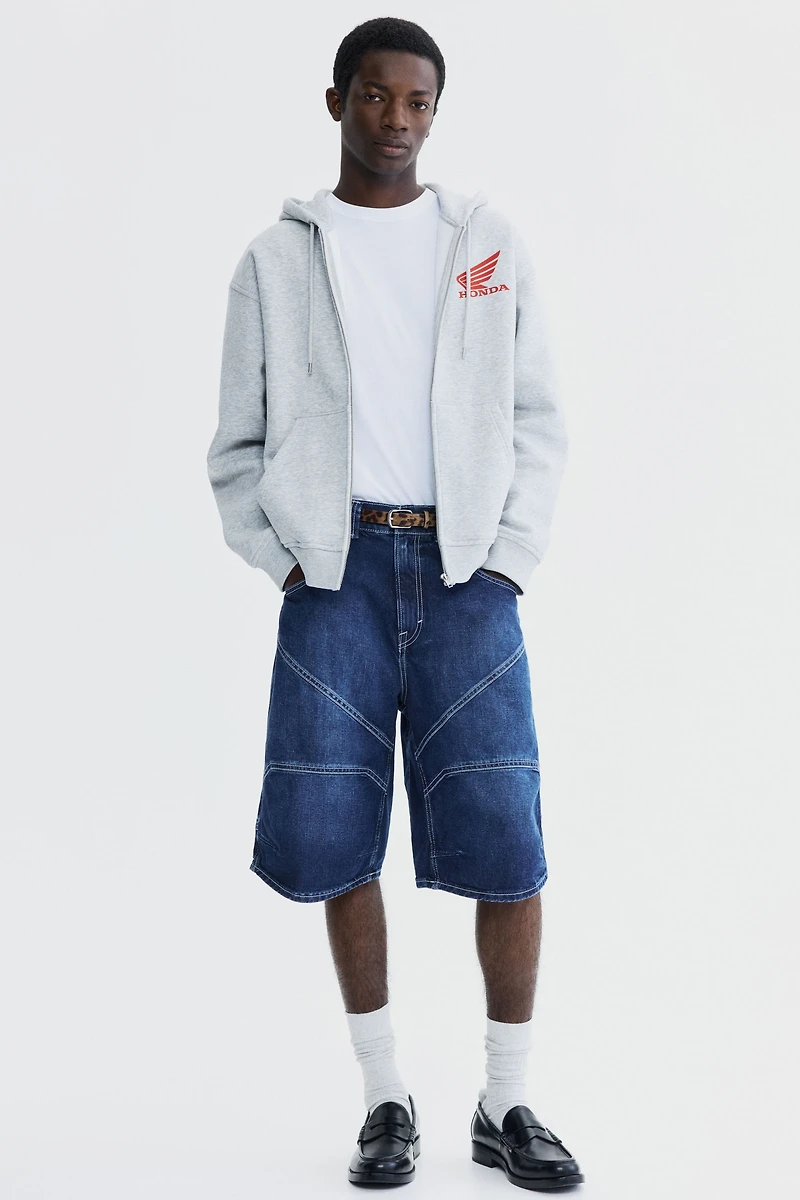 Shorts in rigid cotton denim. Baggy fit from seat to hem with plenty of room around thigh. Regular waist, zip fly with button, front pockets, and back pockets. Rounded legs.