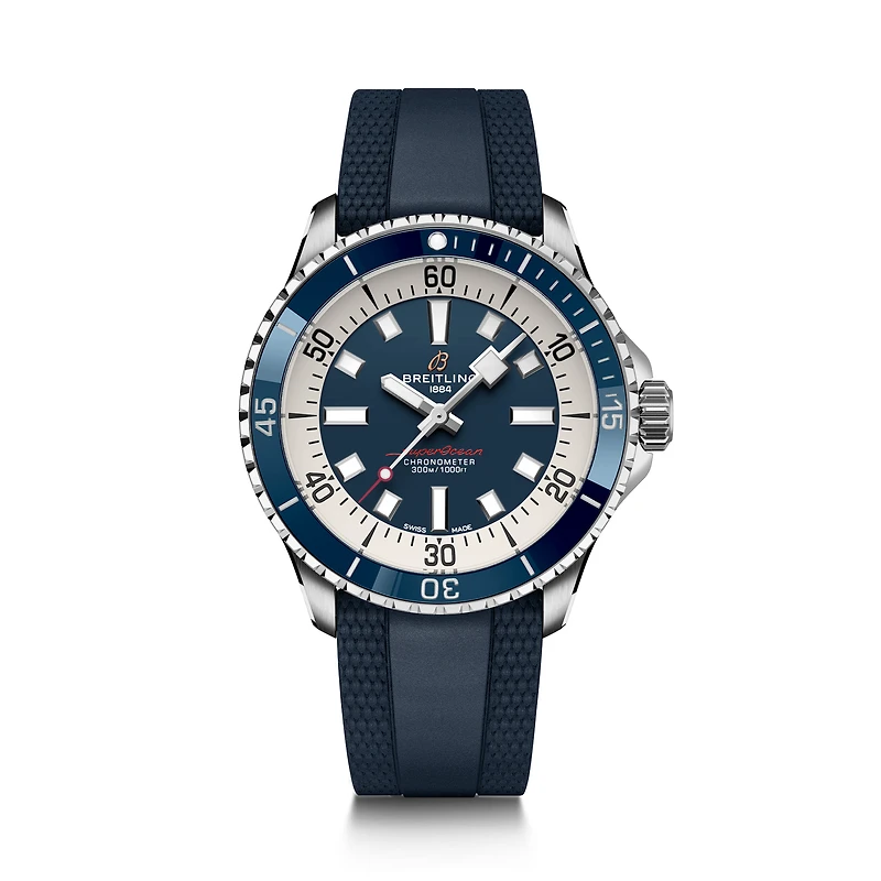 As with all Breitling redesigns that pull from the archives, the new Superocean perfectly balances the nostalgia of its lineage with a fresh new look. Broad hands and indexes coated in luminescent Super LumiNova ® allow for superior readability underwater. At 300 m (1000 ft) water resistance, this watch triples the minimum requirement for dive watches. The rubber strap has a folding clasp that allows for micro adjustments of up to 15 mm for easy wear over rashies and dive suits.