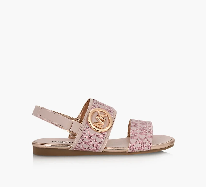 These lovely two strap sandals by MICHAEL KORS are all about chic on-the-go, in a small format for the young fashion maven. Its comfy straps are mounted on a slight heel for a bit of spring to your step, while a hook-and-strap at the heel keeps these lookers secure all day long.