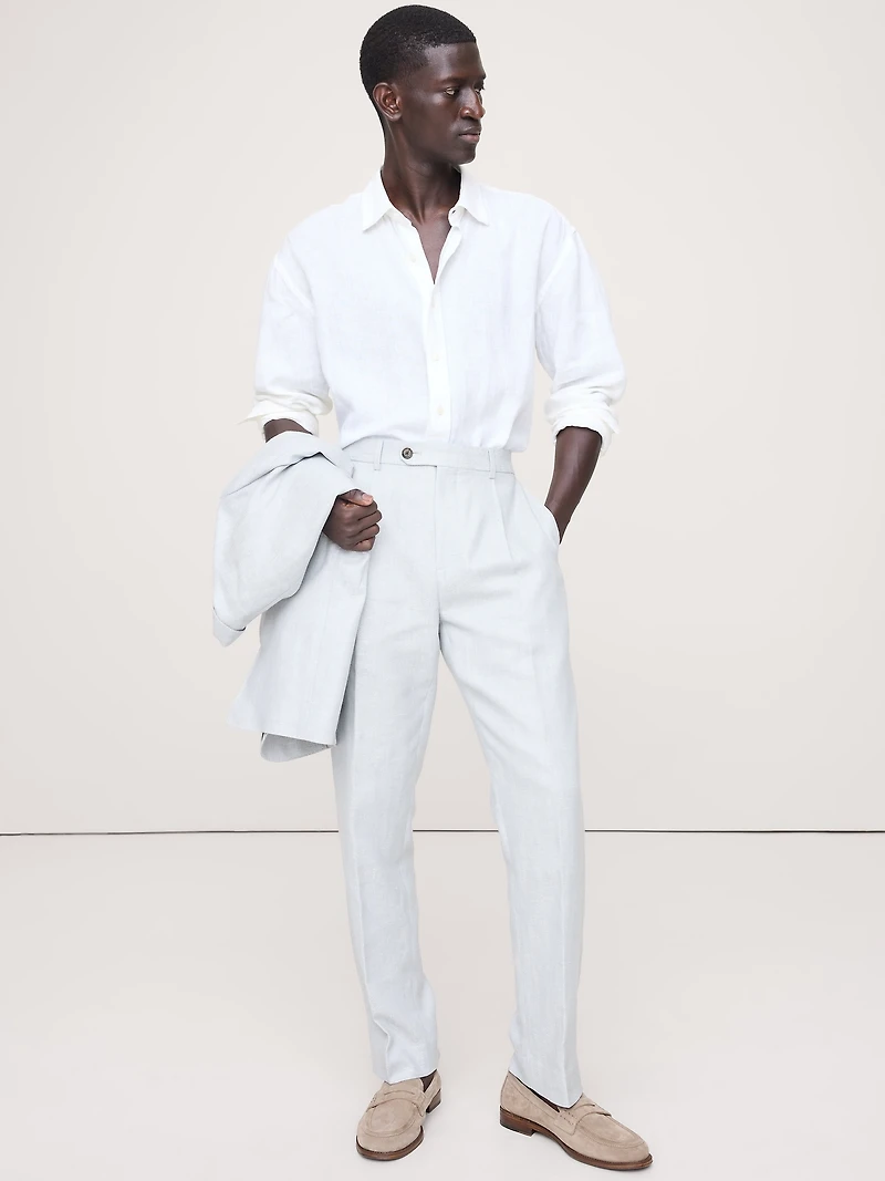 Best dressed at every event. We love the light blue herringbone pattern of this beautiful fabric, woven from lightweight linen and breathable Merino wool. Plus, we cut them in our best-selling Tailored Slim fit with a subtle pleat at the front. Tailored Slim fit: Slim through the leg with a bit of extra length for a distinctive break at the hem. Zip fly with button closure. Front pleats. Belt loops and after-dinner split detail at back. Front pockets. Back pockets with button closure. Half lined (lined to the knee). Extra-length at the hem for tailoring.