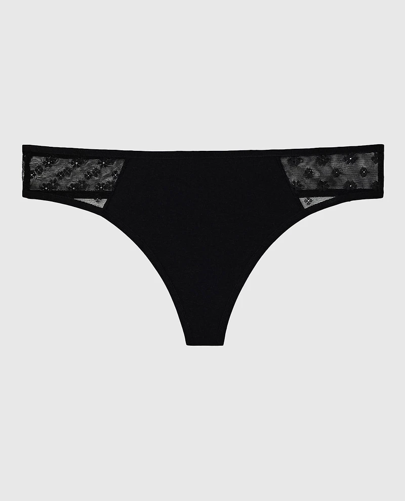 Tes sous-vêtements de tous les jours viennent de devenir encore plus beaux. Cette culotte string rehaussée est conçue avec notre design en coton doux et maille, taille en rond et une couverture minimale des fesses. Polyamide importé, élastane.