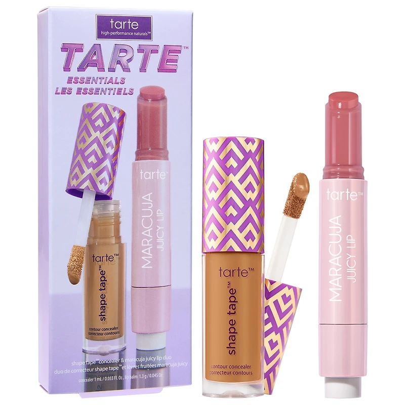 A limited-edition tarte & trade; essentials duo that features travel-size shape tape & trade; concealer and maracuja juicy lip for quick, effortless, no-makeup makeup. Highlighted Ingredients: - Shea and Mango Butters: Moisturize and condition. - Maracuja Oil: Rich in essential fatty acids and vitamin C for smoother, softer-looking lips. Ingredient Callouts: Free of formaldehydes, formaldehyde-releasing agents, phthalates, mineral oil, retinyl palmitate, oxybenzone, coal tar, hydroquinone, sulfa