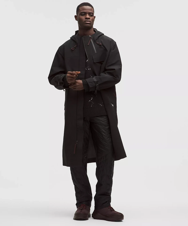 From head to (almost) toe. This waterproof jacket provides extra coverage against heavy rain with its long, calf-grazing length.