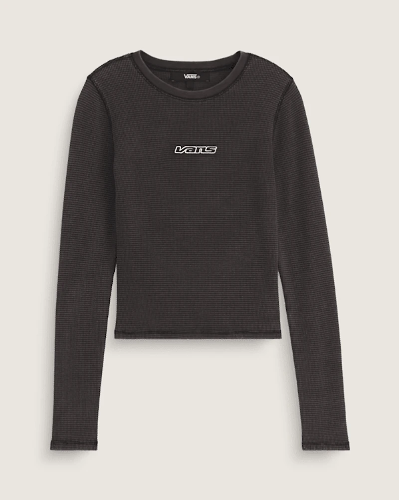 This cropped long-sleeve tee brings laid-back Vans style to your everyday wardrobe. The mineral-washed thermal knit adds subtle texture, while the slim fit and cropped length create a modern silhouette. With a touch of stretch and the classic Vans logo, it's a versatile piece that pairs easily with high-waisted bottoms for an effortlessly cool look.