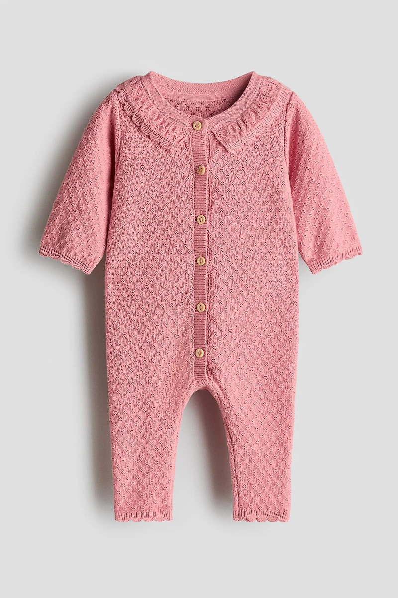 Textured-knit jumpsuit in cotton with ribbed, scalloped-edge trim. Collar, round neckline, buttons at front, long sleeves, and long legs.