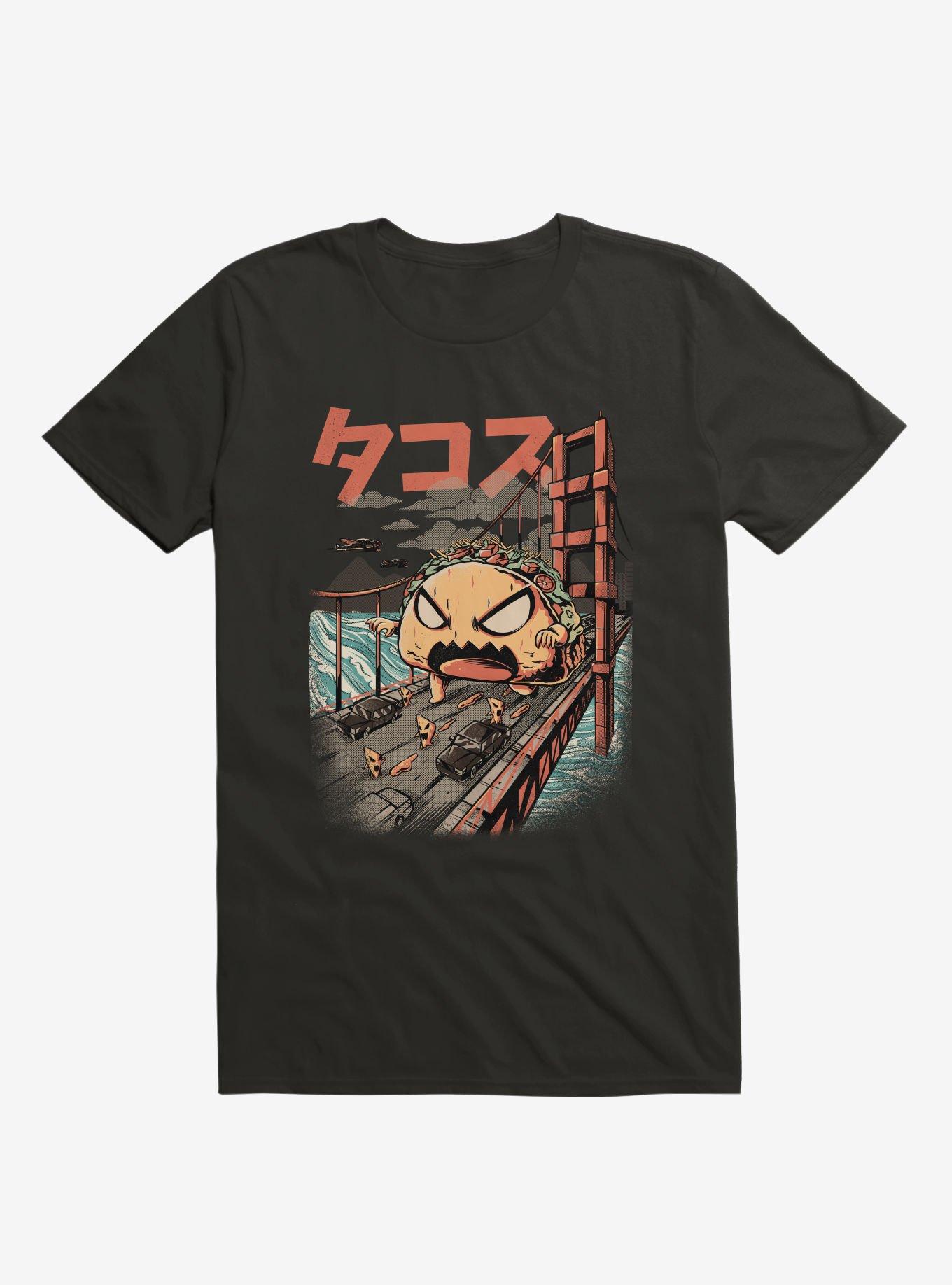 Taco 'bout scary. This lightweight black tee features the Takaiju on the loose. He is, as you'd expect, a little on the crunchy side. Bring all your hot sauce and defeat him once and for all! Officially licensed art from ilustrata.