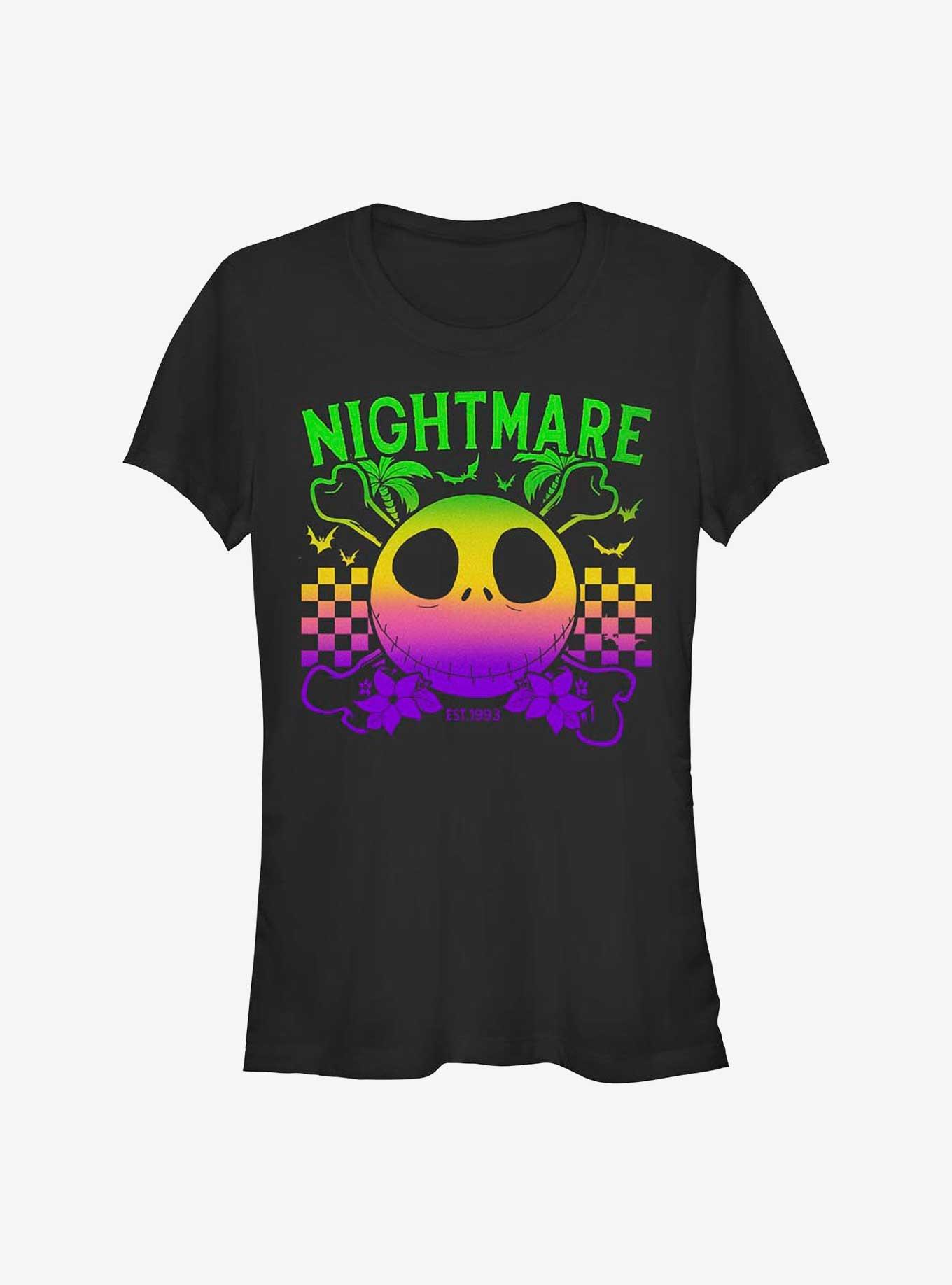 Life's a beach -- and from the looks of it the afterlife is, too! This fitted tee has a rainbow ombre graphic featuring Jack Skellington, palm trees, a checkered print, and flowers.