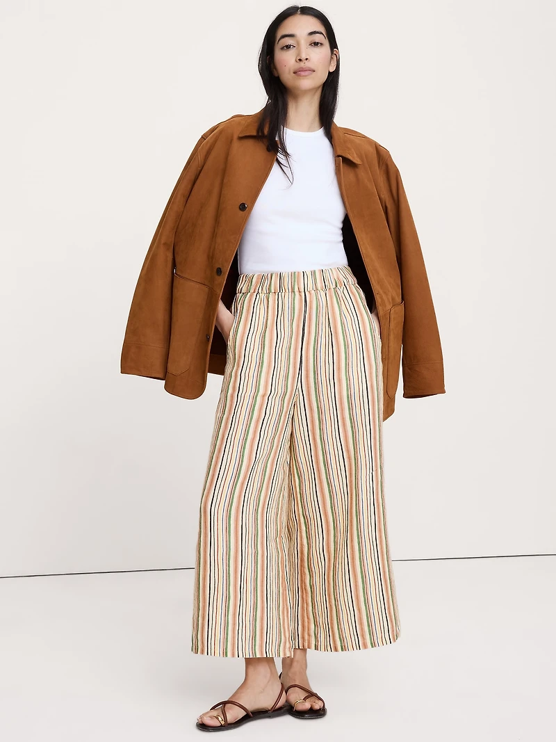 The vibe is vacation: an easy pull-on design, a relaxed silhouette, and roomy pockets. Here, we reached for our favorite 100% certified-European linen. Relaxed fit: High rise. Relaxed through hip and thigh with a wide leg. Ankle length. Elastic waistband (pull-on design). Front and back pockets. Unlined.
