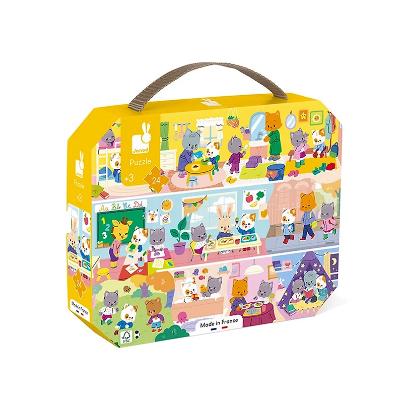 Welcome to the Cat family! This 24-piece cardboard puzzle helps children understand the concept of time and identify everyday rituals. With this puzzle, children aged 3 and up develop their concentration and fine motor skills. From waking up to bedtime, including meals, bath time, and playing soccer with friends, they follow the little daily routines of the Cat family. Children discover their typical day piece by piece and enjoy imagining their lives—enough to keep them occupied for hours! This puzzle encourages young children to use their deductive reasoning skills. Delivered with a poster as a guide for beginners, they can then complete the puzzle independently as they gain more autonomy. Measuring 50 x 40 cm, this puzzle is made in France from FSC™ certified cardboard and comes in a pretty carrying case, making it easy to take anywhere. Printed with vegetable-based inks.