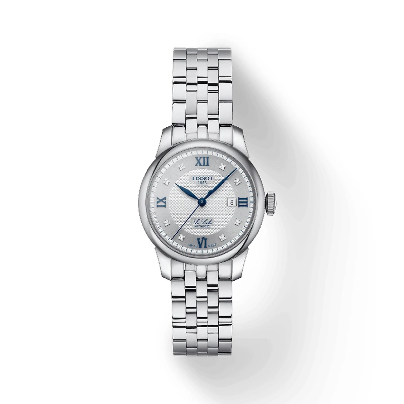The Tissot Le Locle Automatic embodies Tissot's tradition of craftsmanship. Named after the brand's home town in the Swiss Jura mountains, this Tissot Le Locle Automatic Lady (29.00) 20th Anniversary is the 20th anniversary model of the Le Locle collection, launched in 2003 to mark the brand's 150th anniversary.With a 29-millimeter 316L stainless steel case, this elegant watch features a Powermatic movement with a Nivachron balance spring resistant to magnetic fields, and a power reserve of up to 48 hours. Its tireless work can be observed through the transparent glass caseback.Protected by a scratch-resistant sapphire crystal, the silvered dial displays blue Roman numerals at 12, 3, 6 and 9 o'clock, the date and eight diamonds forming the hour markers.The Tissot Le Locle Automatic Lady (29.00) 20th Anniversary comes with two bracelets that can be switched up easily and without tools thanks to a quick-change system: a 316L stainless steel bracelet and a dark blue leather strap