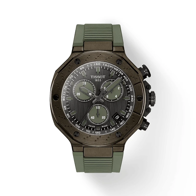 With its new design, including a more elevated dial, the Tissot T-Race Chronograph gets more elegant without denying its sporting roots. Inspired by the partnerships between Tissot and motorcycle racing, the T-Race Chronograph reflects the dynamism of motorcycles and the emotion of the sport. The watch is water-resistant up to a pressure of 10 bar (100 m), equipped with a quartz chronograph movement and features hour and minute hands coated with SuperlumiNova. The scratch-resistant, anti-reflective sapphire crystal guarantees enhanced robustness. This version of the Tissot T-Race Chronograph features a khaki-green PVD-coated stainless steel case, a black dial with khaki accents and a matching rubber strap.