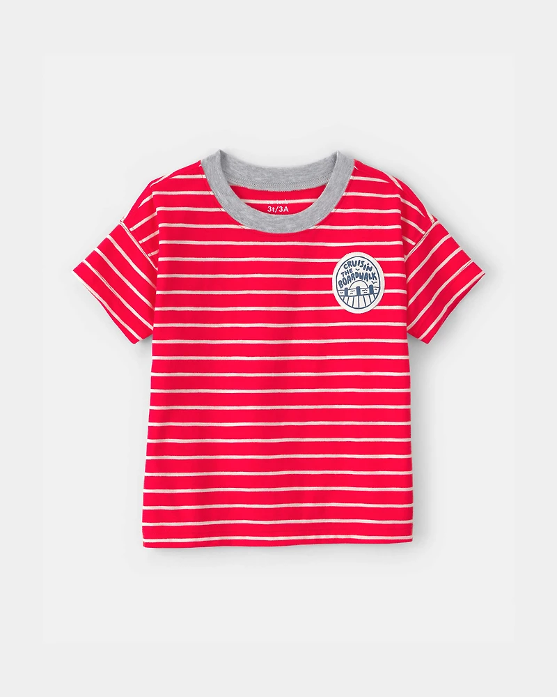 Brighten up your child's casual wardrobe with this relaxed-fit striped tee, designed for everyday adventures. The vibrant red and crisp white stripes create a fun, sporty look that pairs effortlessly with shorts or jeans, making it a versatile favorite for playdates or family outings. Crafted for comfort, the soft fabric feels great against the skin, while the easy pull-on style ensures dressing is a breeze. Plus, the playful patch detail adds a trendy touch that kids love.